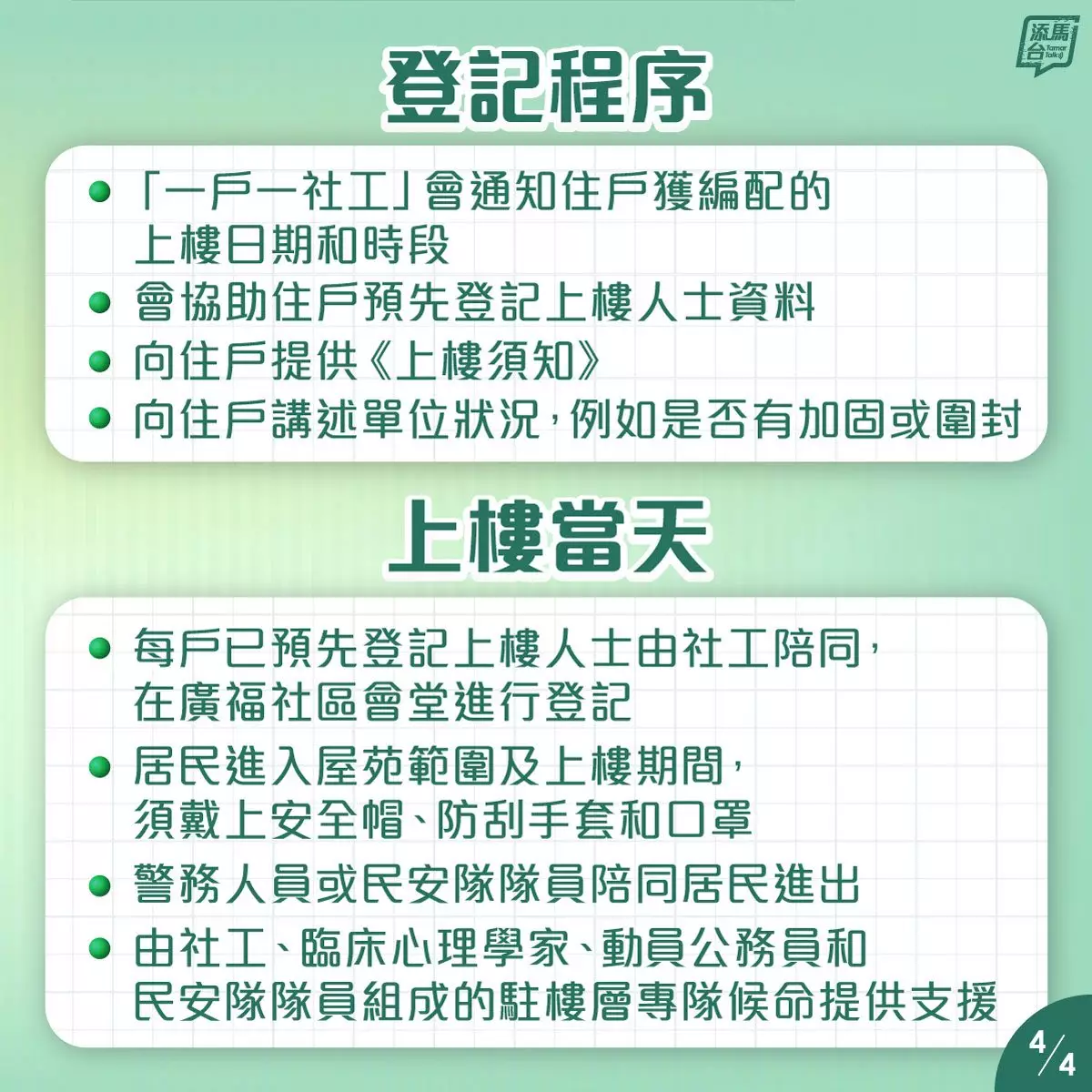 七幢樓宇共有1700多住戶,上樓人數接近7000人。需要做好上樓的流程和不同部門人員的調度和分工,如護送居民、人流管理、情緒支援、應急措施等。上樓期間,政府每天要出動逾1000名來自警務處、房屋署、民政事務總署、社會福利署、民安隊等部門的同事,以及公務員事務局動員的其他公務員,支援上樓安排。
