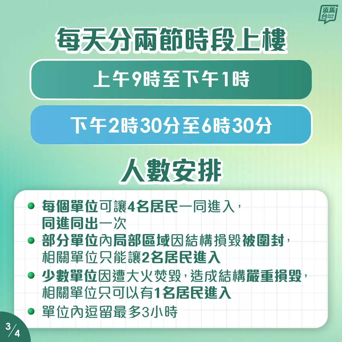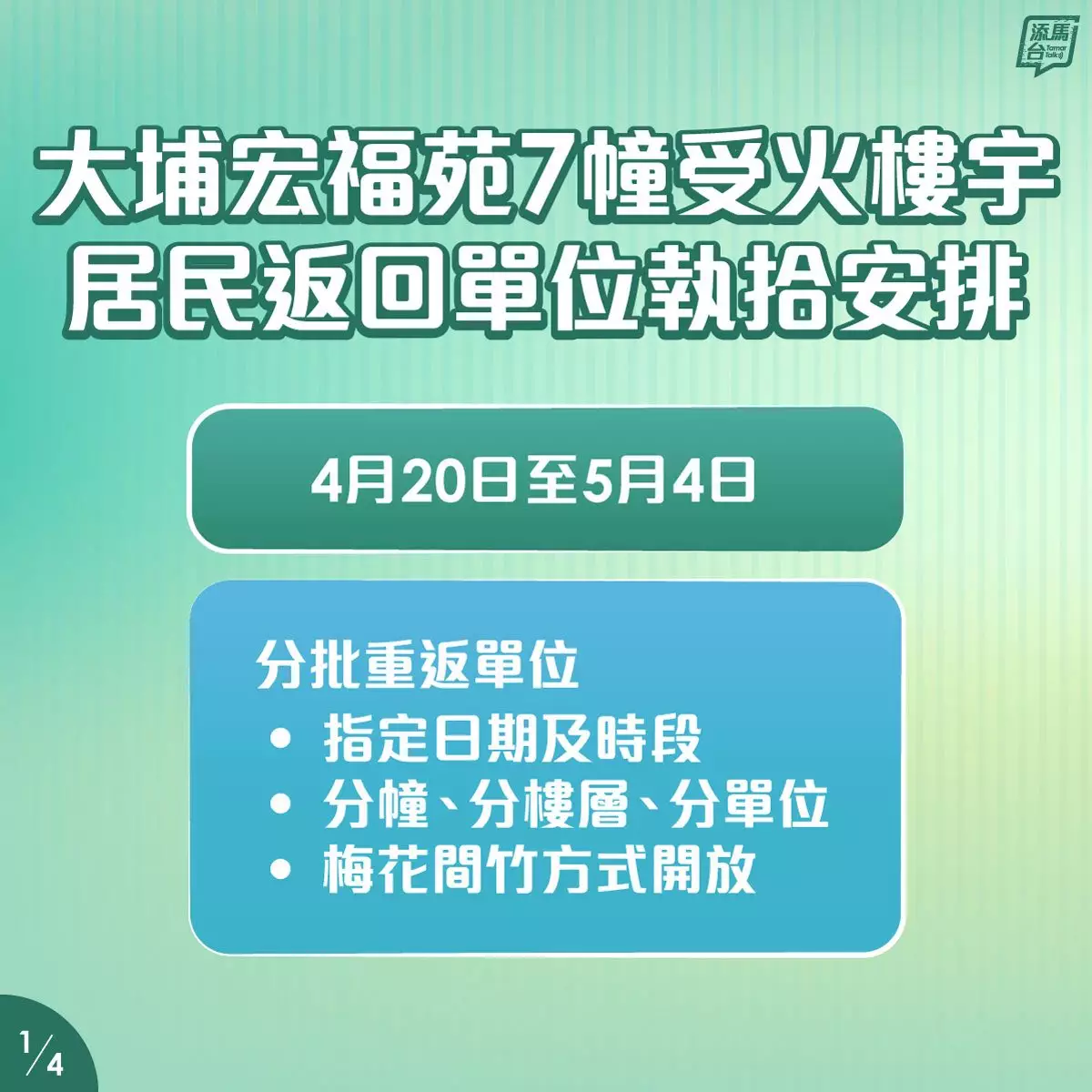 今日下午,卓永興公布了以下讓宏福苑七幢受火樓宇的居民返回單位執拾物品的有關安排。由4月20日開始至5月4日,七幢樓的居民會於指定時間分批返回單位。每個單位可讓4名居民進,惟部分單位局部的區域因結構損毀被圍封,只能讓2名居民進入,少數單位更因焚毀令結構嚴重受損,只能有1名居民進入。不計算上落樓的時間,居民可於單位內逗留三個小時。