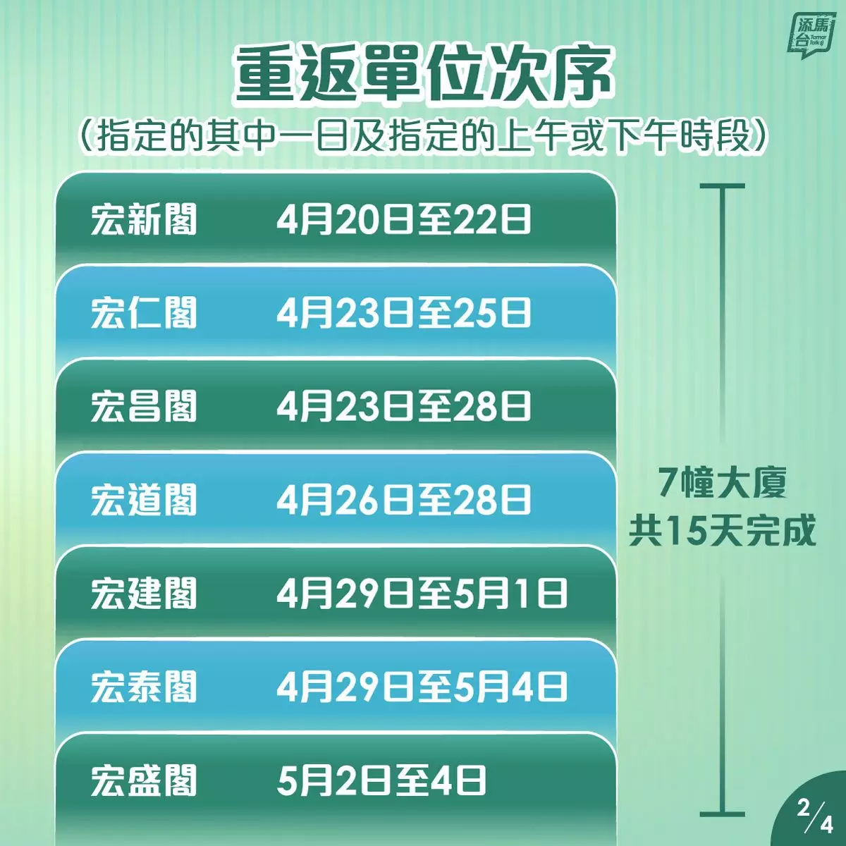 開放會分三分輪進行。第一輪(4月20日至22日)最先開放宏新閣,以適應並走順流程。之後的第二輪和第三輪,每日會同時開放兩幢樓宇。第二輪(4月23日至28日)會開放宏昌閣及先後加上宏仁閣、宏道閣,繼而在第三輪(4月29日至5月4日)開放宏泰閣及先後加上宏建閣、宏盛閣。每幢都是會分樓層、分單位,以梅花間竹的方式開放,避免樓上樓下和同層相鄰單位的居民集中在同一時段返回單位,以確保人流暢順和將風險減至最低。