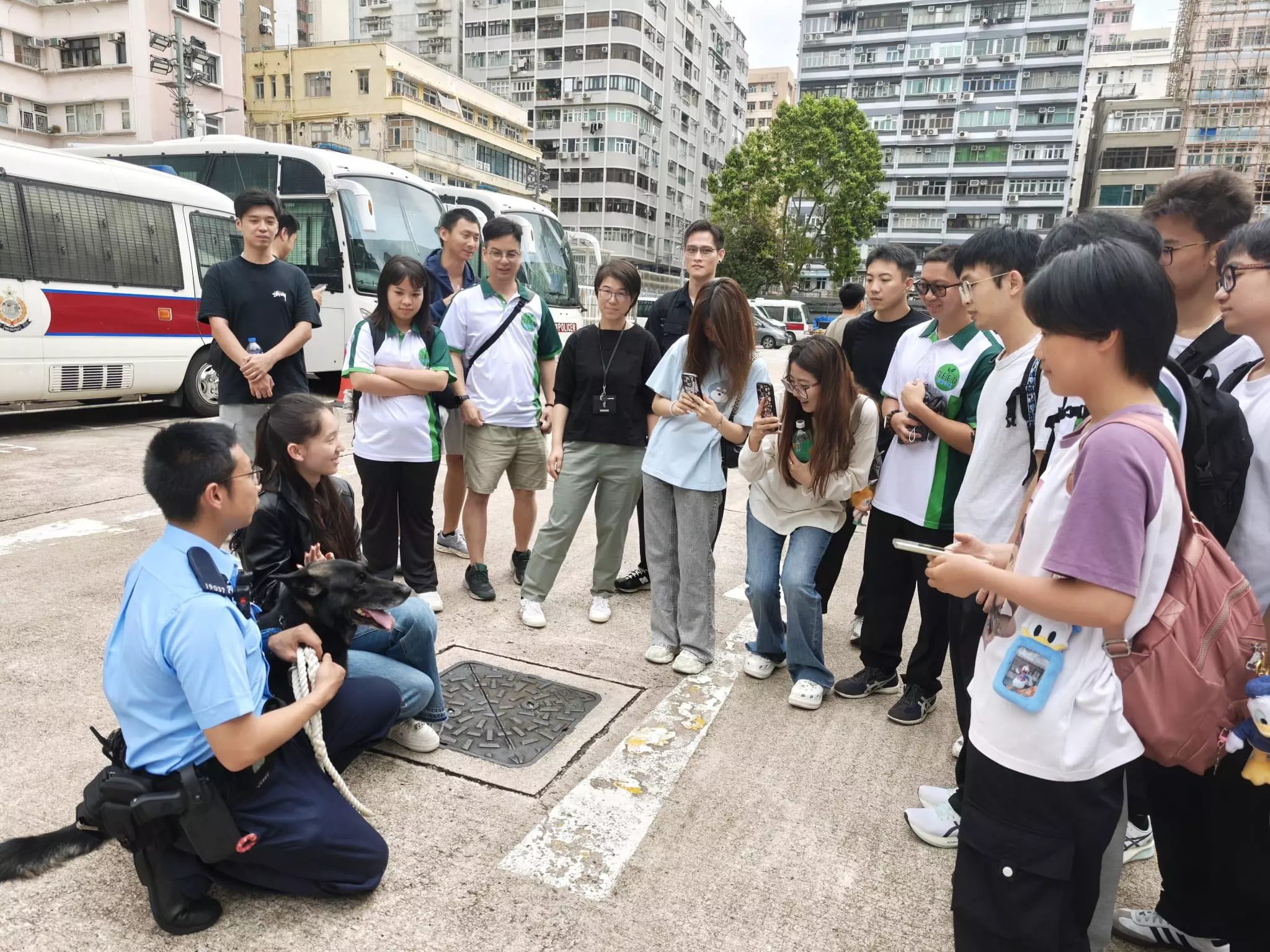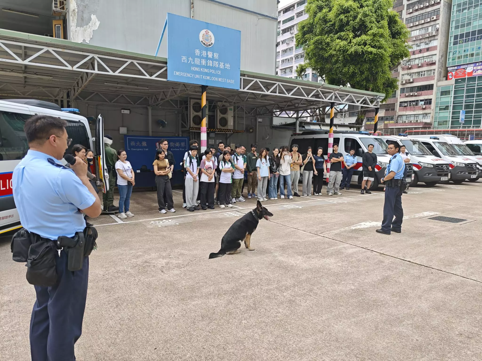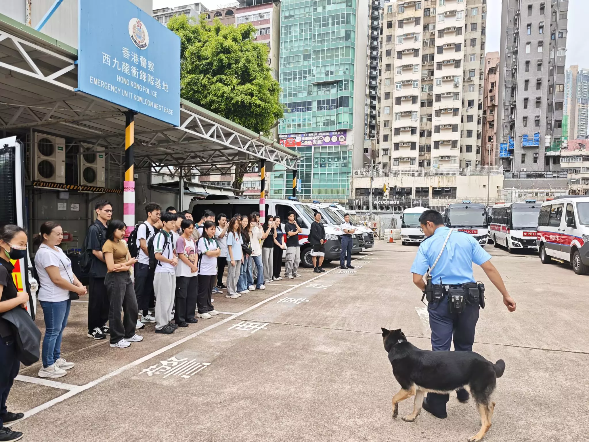 活動內容非常豐富,同學們先到西九龍衝鋒隊了解日常工作、接觸警察裝備及槍械展示,更可親身穿上防彈衣與警車合照,感受一下警察工作時的「重量」,最後亦有警犬表演環節。