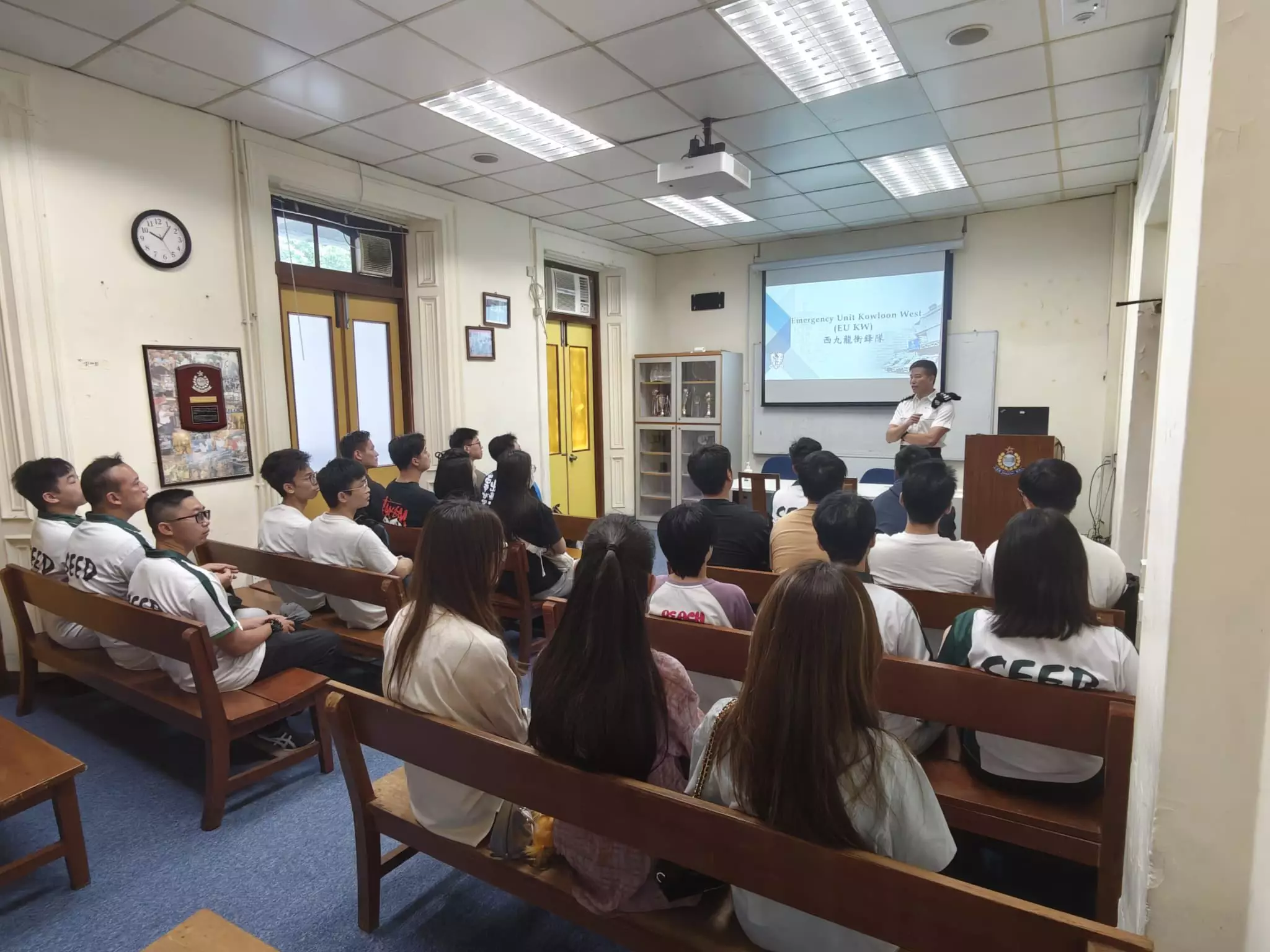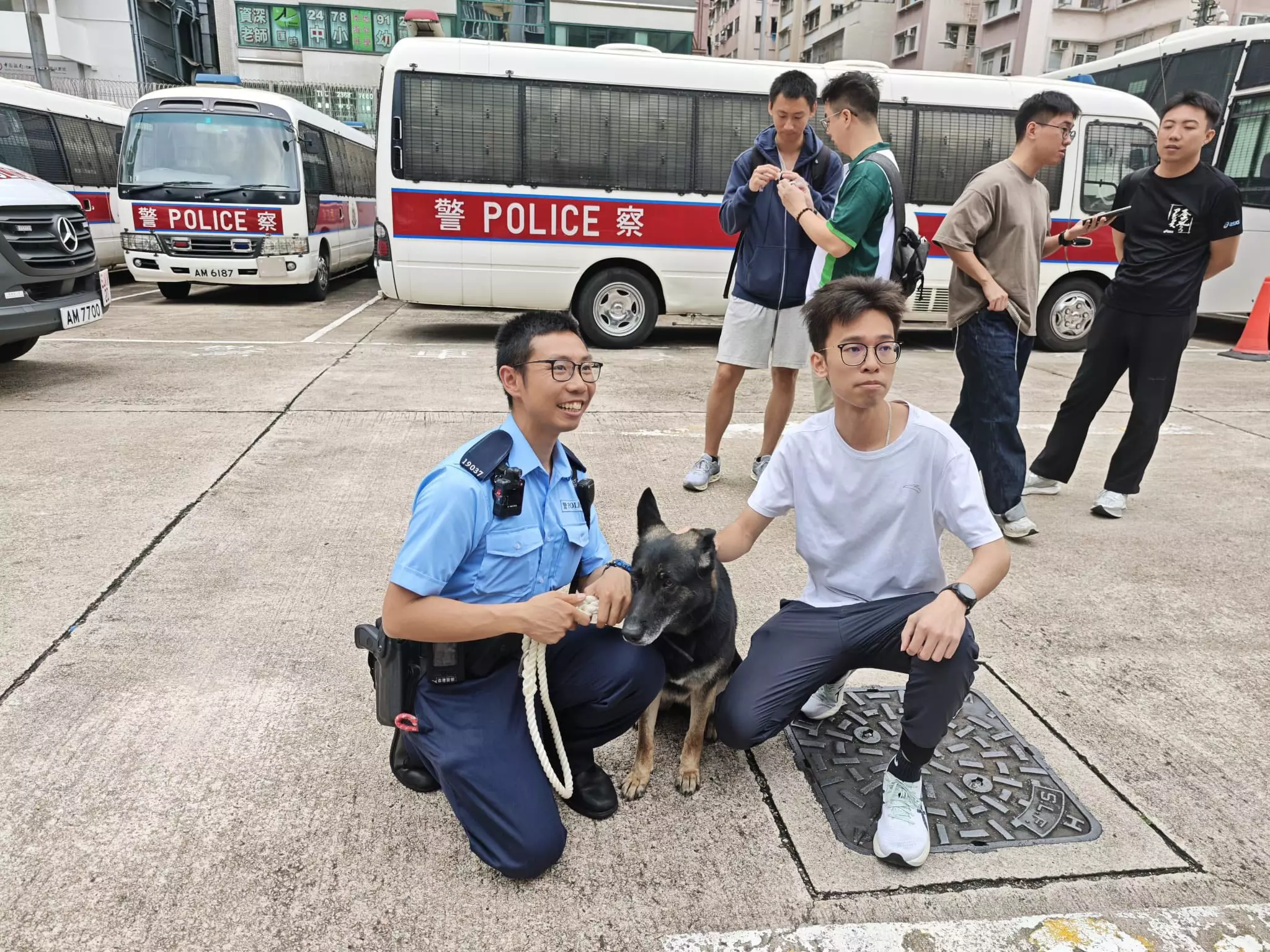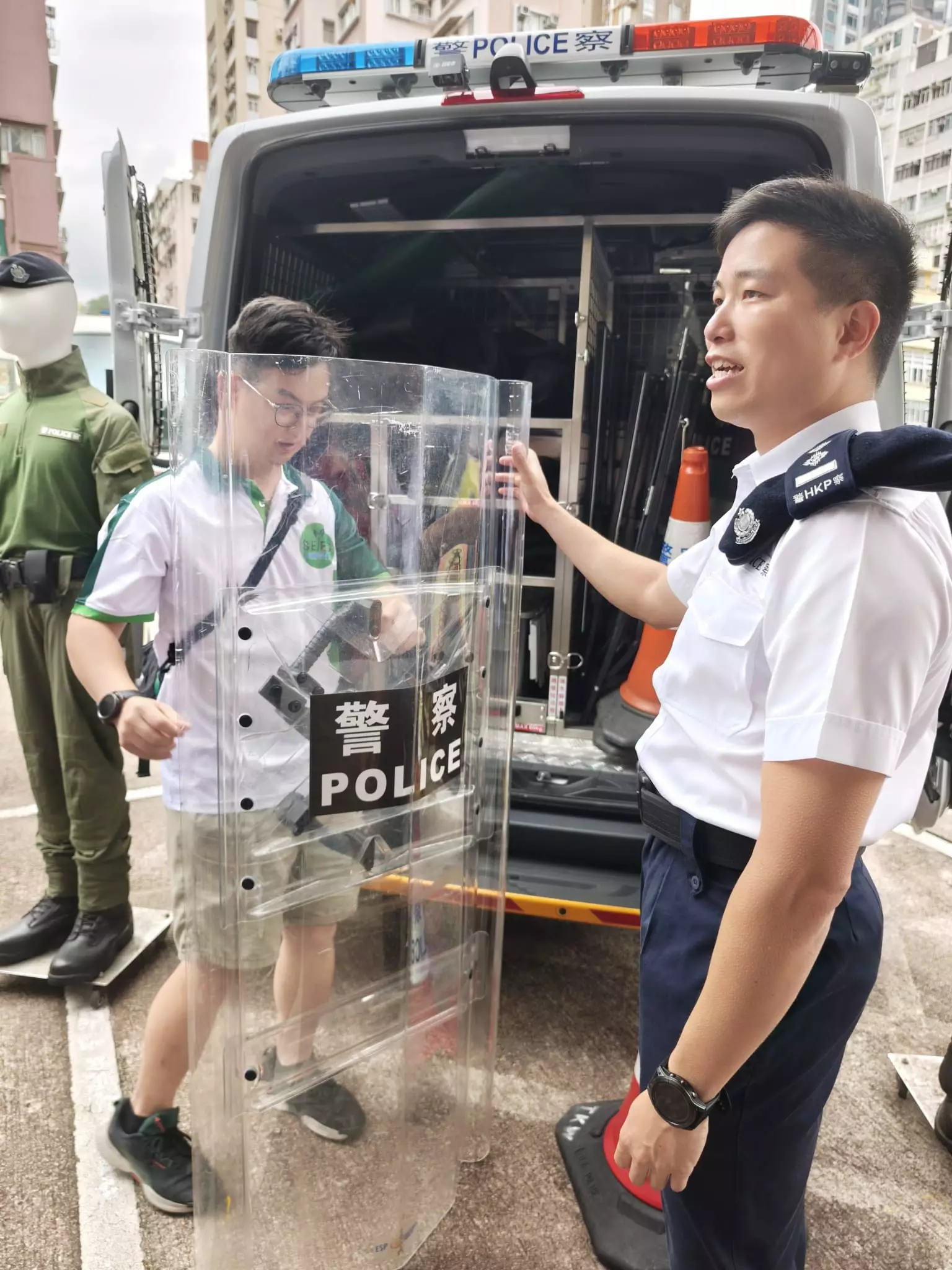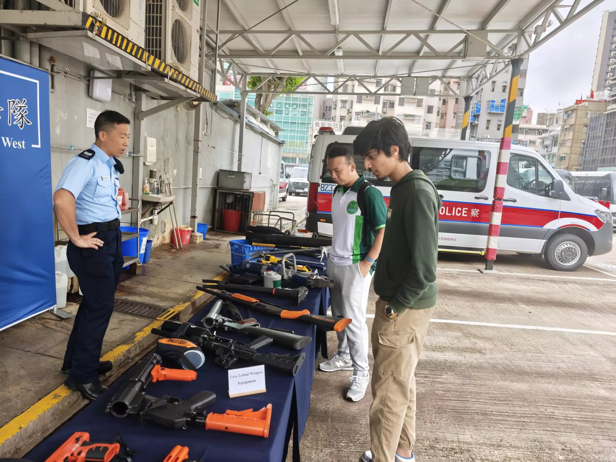 活動內容非常豐富,同學們先到西九龍衝鋒隊了解日常工作、接觸警察裝備及槍械展示,更可親身穿上防彈衣與警車合照,感受一下警察工作時的「重量」,最後亦有警犬表演環節。