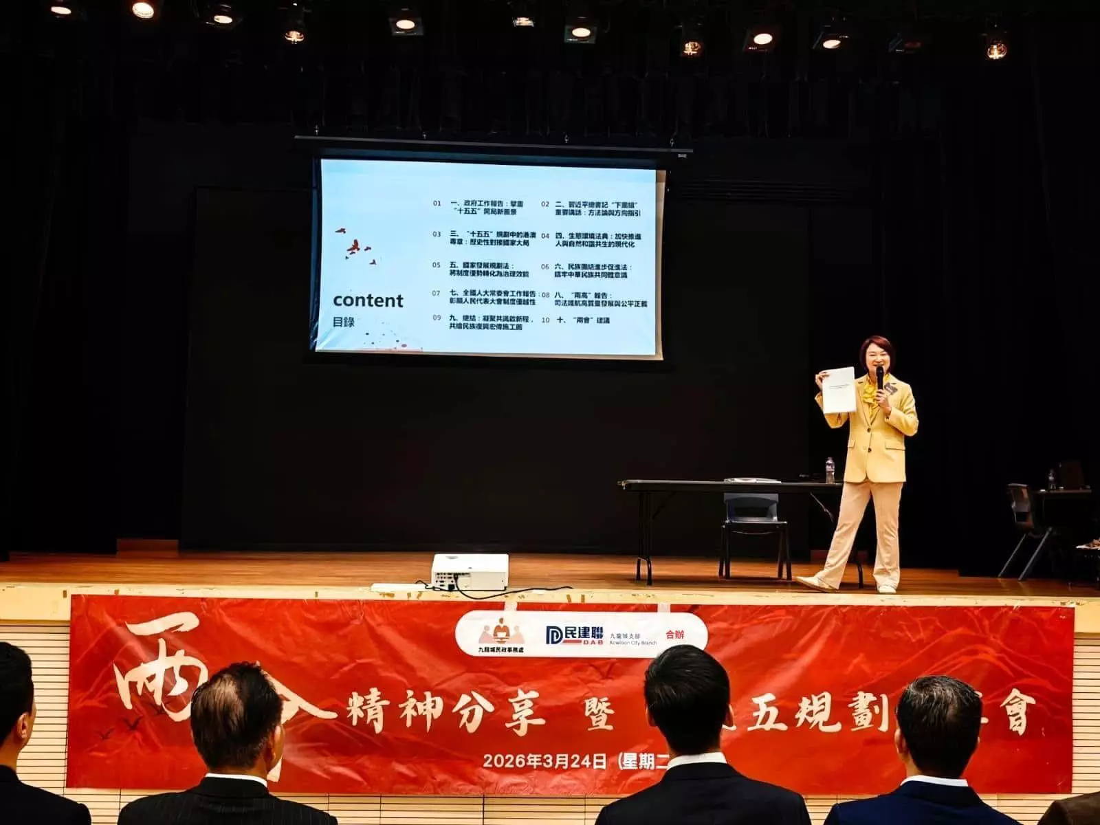 上星期二(24/3),九龍城民政處聯同民建聯九龍城支部合辦「兩會精神分享暨『十五五』規劃分享會」。九龍城民政專員蔣志豪喺致辭中強調,學習兩會精神對地區治理及社區發展有莫大裨益,鼓勵大家深入了解國情,緊貼國家發展步伐,共同為建設更美好嘅九龍城出一分力。全國人大常委、立法會主席李慧琼亦深入淺出地剖析今屆兩會嘅重要精神,以及國家「十五五」規劃嘅宏觀藍圖,並勉勵大家認清國家發展大勢,發揮香港背靠祖國、聯通世界嘅獨特優勢,以及融入國家發展大局,把握黃金機遇。全國政協委員樊敏華亦鼓勵大家將兩會精神轉化為服務社區嘅實際行動,令大家深受鼓舞。
