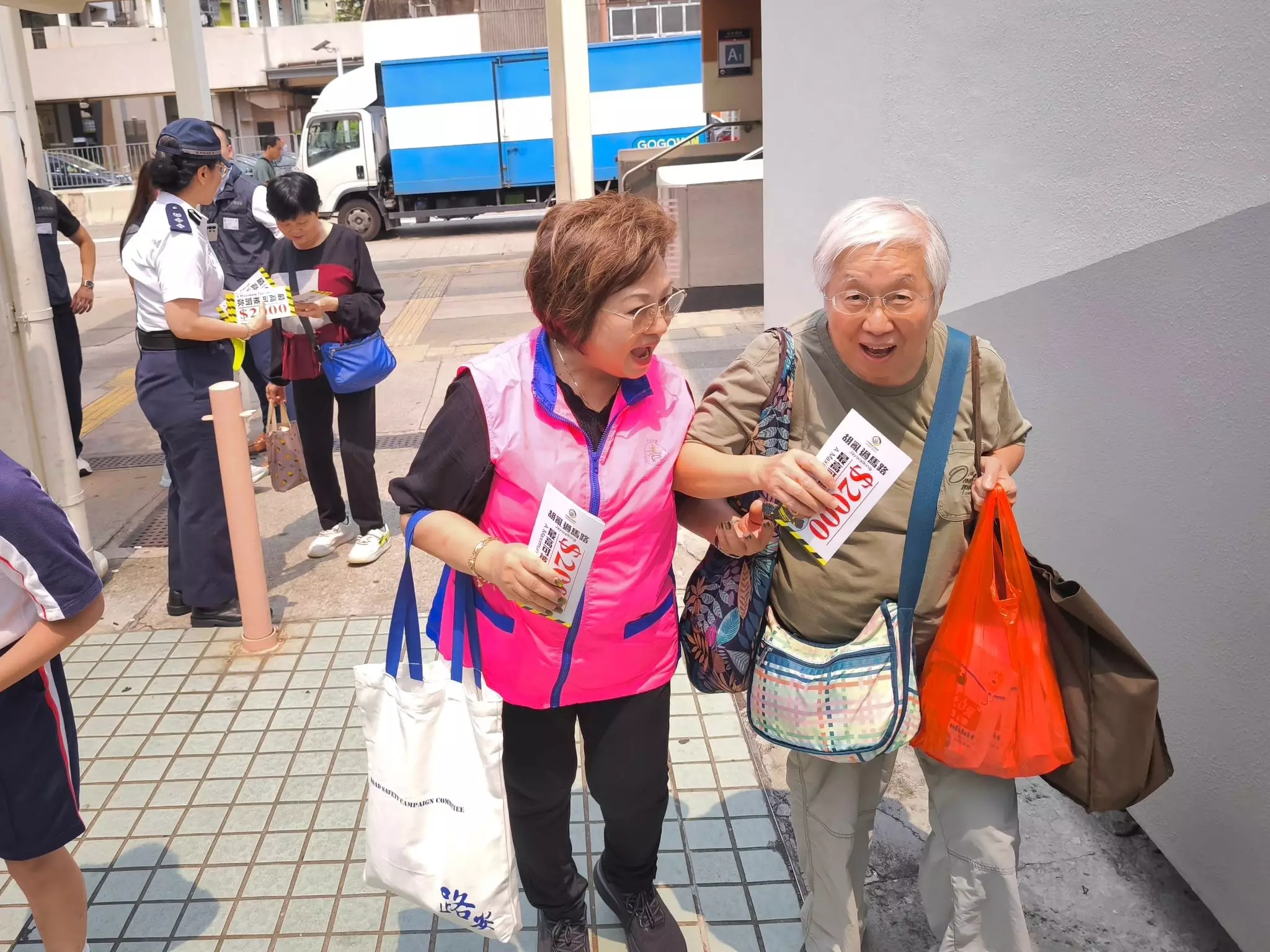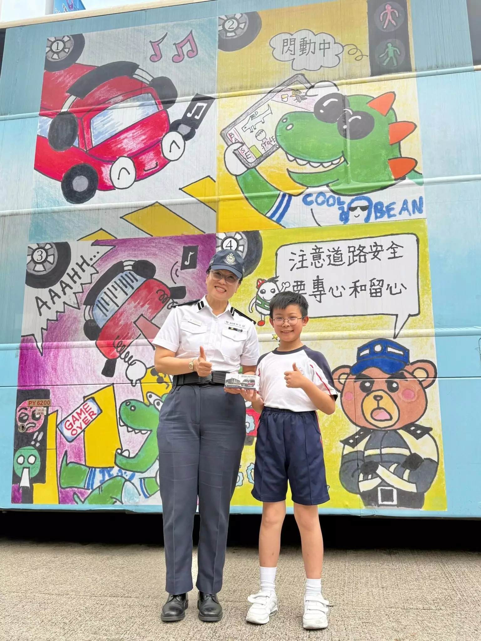 今日(14日),深水埗警區指揮官潘瑞屏署理總警司 ,聯同警區警民關係組及區交通隊、深水埗區道路安全運動委員會會長們、九巴代表,以及冠軍作品的創作者 — 深水埗聖方濟各英文小學的李孝元同學 ,一同出席宣傳活動 ,向市民派發道路安全單張及紀念品 ,共同宣揚安全意識。印有冠軍作品的巴士亦驚喜亮相助陣 。