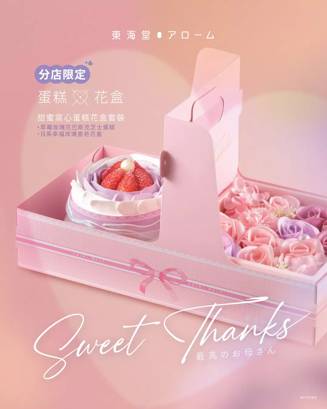 與此同時,今個母親節更可為媽媽送上另一份窩心的驚喜,凡購買任何母親節蛋糕系列,即可以$89加購「絢麗玫瑰康乃馨香皂花束」或「日系幸福玫瑰香皂花盒」,把媽媽的忙碌片刻換成Chill溫馨時刻!另外,由4月15日起至5月7日期間於東海堂アローム門店或網上訂購「Sweet Thanks最高のお母さん」母親節蛋糕系列,更可尊享低至86折早鳥優惠,各位孝順仔女記得提早準備,以最優惠價錢,為媽媽送上多重祝福與驚喜!尚有更多款式等你發掘,包括網上限量300個的瑰麗愛意手袋蛋糕,以幼滑茉莉茶忌廉及手工唧花手藝,打造出像真度極高的粉色調「包包」,讓媽媽瞬間重拾少女心!