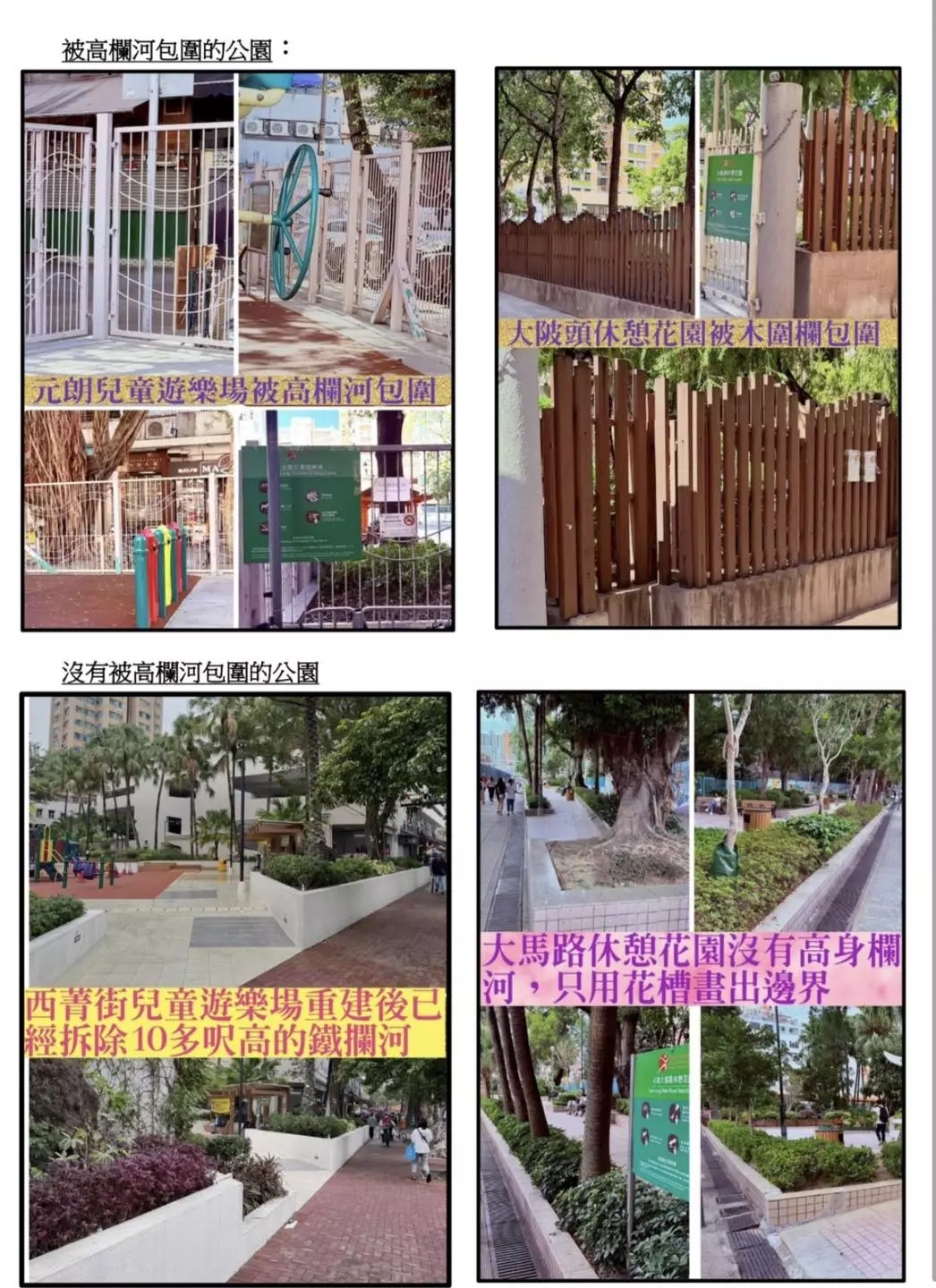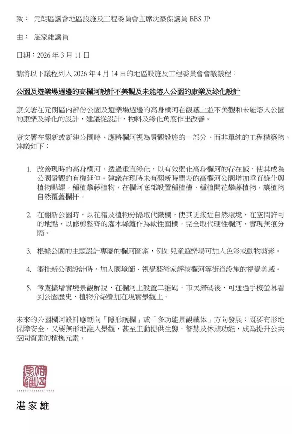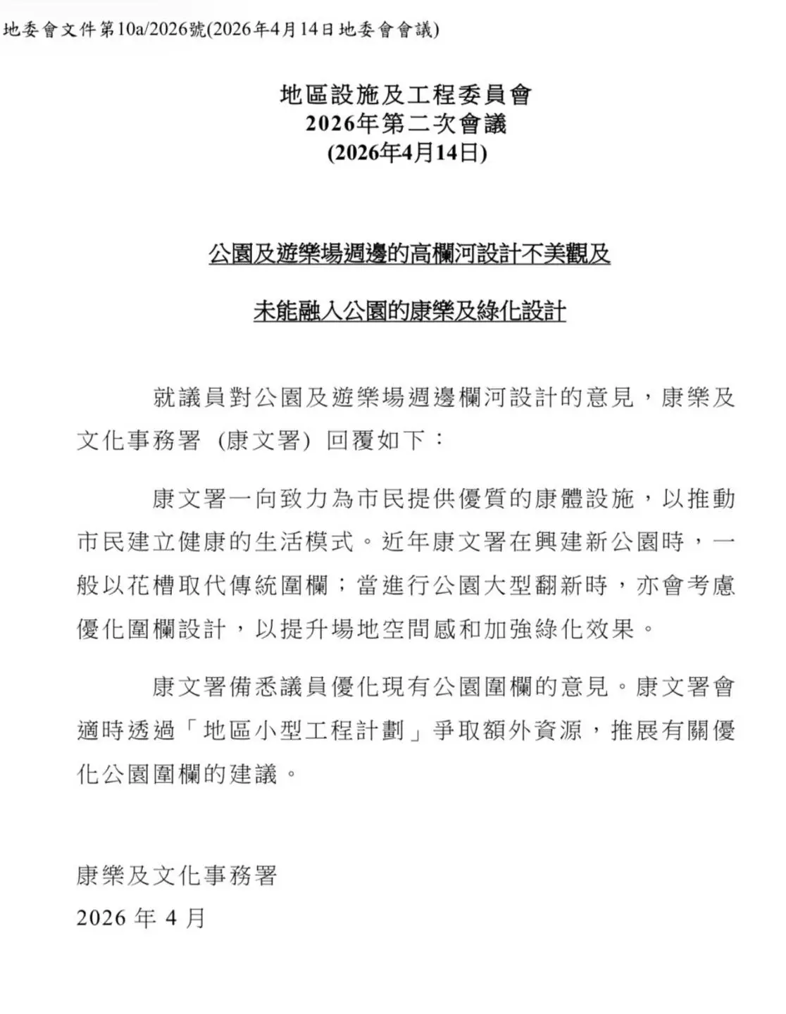 據了解,目前部分公園及遊樂場周邊的高欄河設計存在觀感不佳、與周邊綠化及康樂設施融合度不足的問題。對此,區議會提議康文署對相關高欄進行優化,以花槽及植物分隔取代現有鐵欄,讓設施更貼近自然環境。