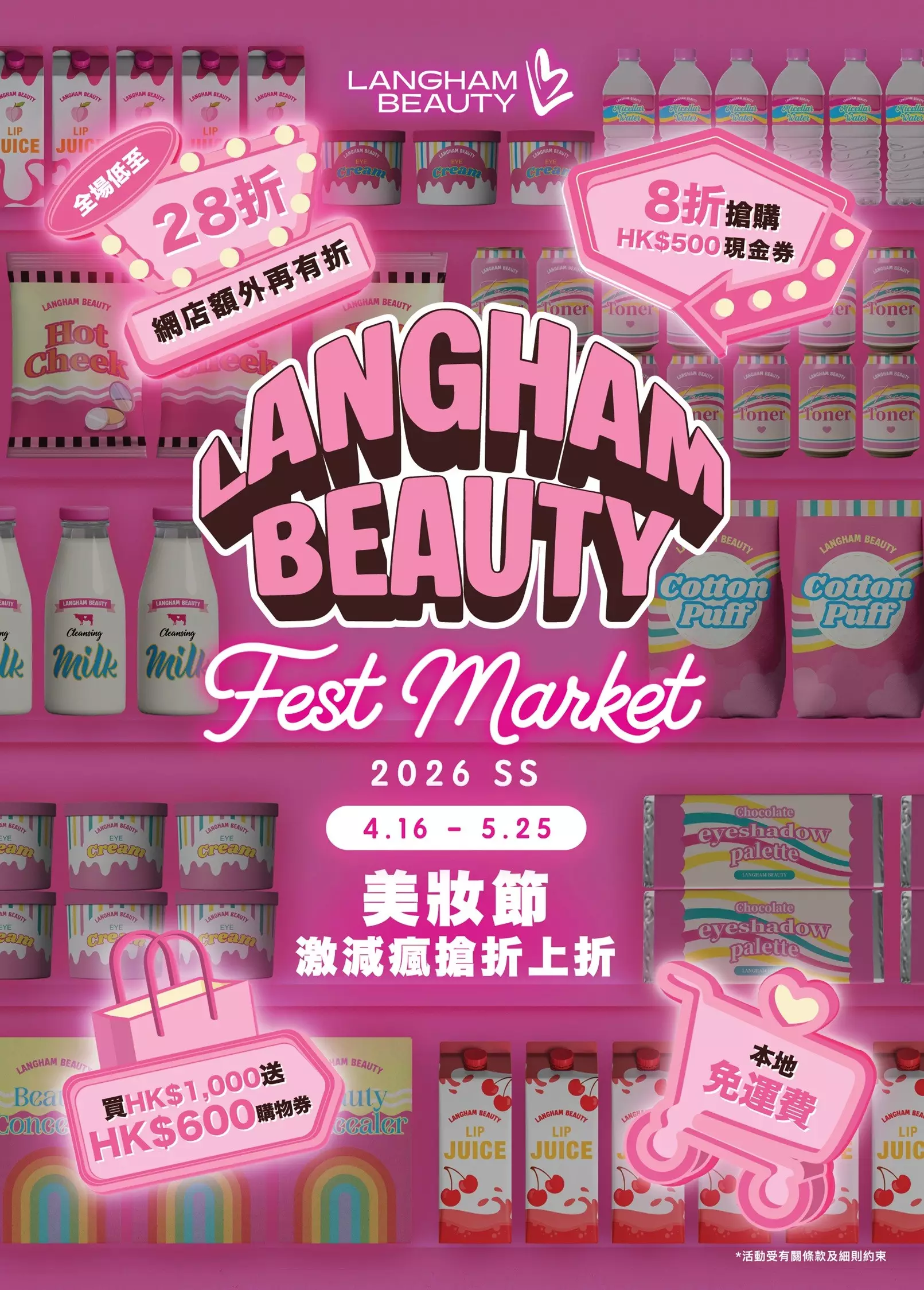 由4 月 16 日至5月25日期間,朗豪坊旗艦美妝品牌LANGHAM BEAUTY亦舉行半年一度美妝盛事「LANGHAM BEAUTY Fest SS26 美妝節」。今季以「激減瘋搶折上折」為主題,聯同超過60個國際頂級美妝品牌,推出逾300款獨家激減套裝,折扣低至28折!顧客可於官方網店8折搶購現金券,門市消費滿HK$1,000,即獲贈總值HK$600購物券組合,於L2指定品牌消費滿HK$1,200再即減HK$100。疊加多款購物券使用,享受「直接扣減」的掃貨快感!