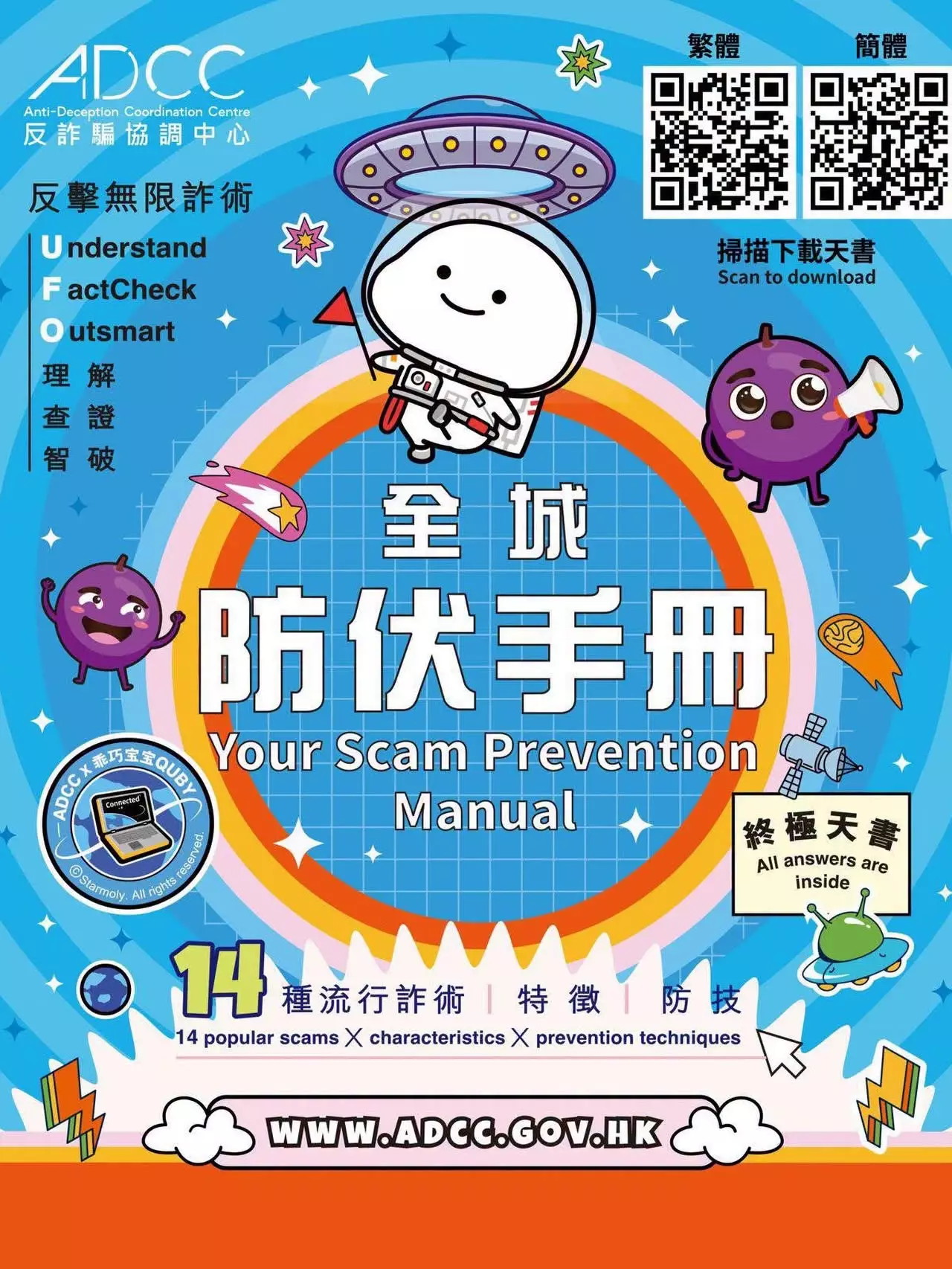 《全城防伏手冊》: 呢本防伏手冊,收錄咗最流行的14種詐騙手法,等大家一冊在手,全家人都唔會輕易中招!