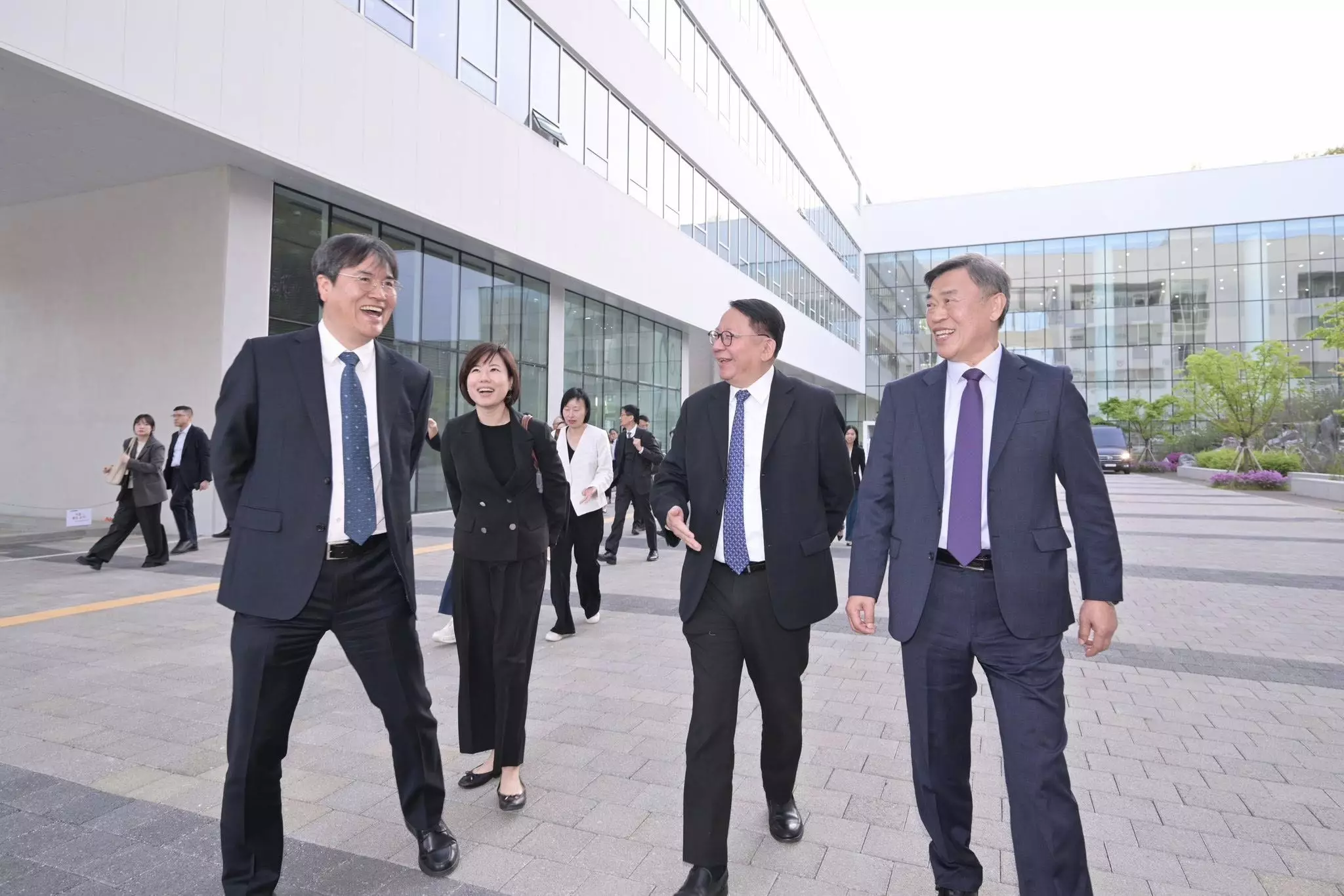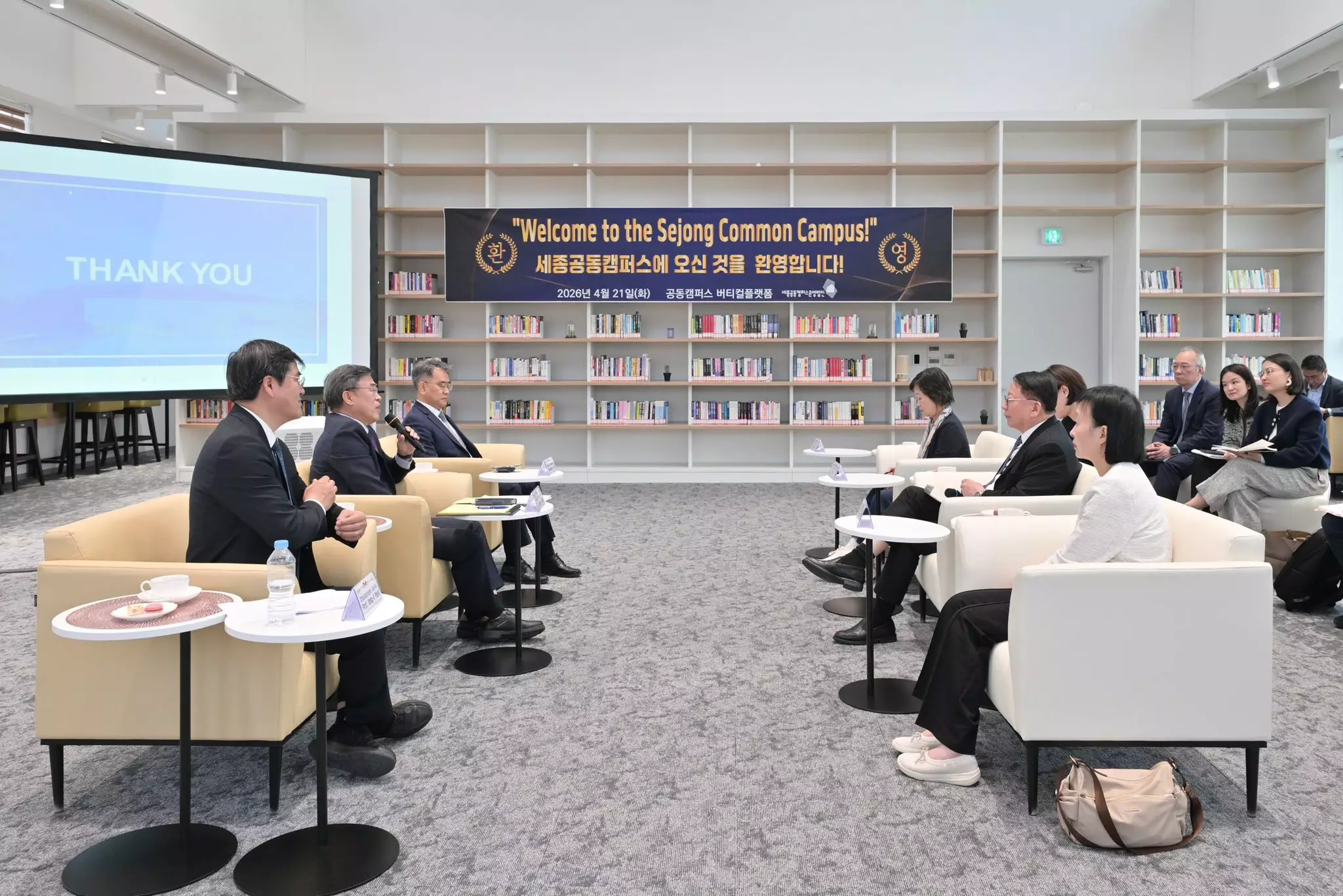 大家之後到訪前年開始啟用的世宗共同校區,並與校區運營法人理事長韓晳洙會面,深入了解校園的規劃和運作模式。世宗共同校區是一個共享型校園,最大的特色在於打破大學與大學之間的壁壘,打造了一個匯集多所知名院校、頂尖設施、開放且協作的生態系統。多所院校會共同使用圖書館及宿舍等硬件設施,這種「無邊界」的模式,正是規劃大學城時所需要的創新構想。