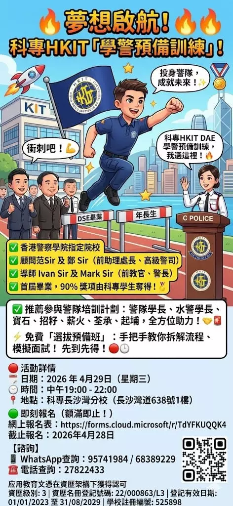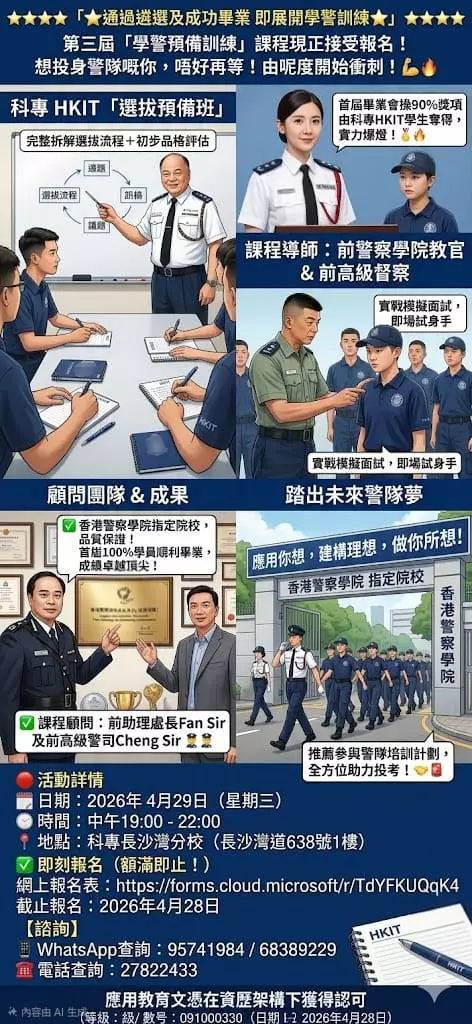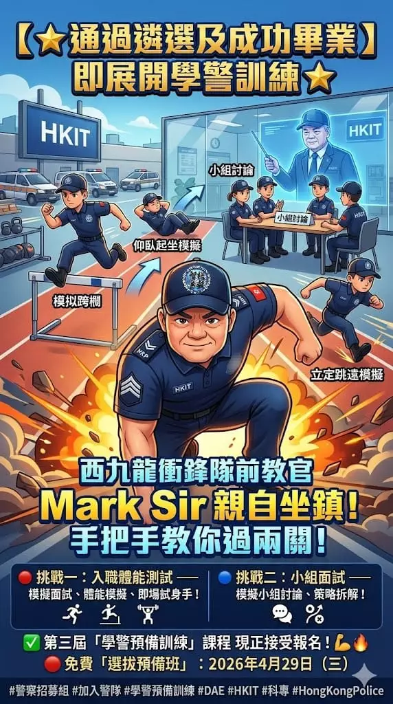 歡迎大家報讀由 #香港科技專上書院(科專HKIT)與「 #警察招募組 」及「 #警察學院 」攜手開辦全新的「#學警預備訓練」課程