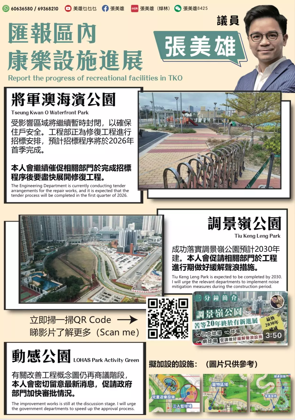 連結已複製! 將軍澳康城海濱公園因設施損壞需開展修復工程,區議員張美雄已向港鐵工程部進行督促,要求其加快推進設施修復工程,保障市民出行安全與便捷。 目前,港鐵工程部正全力推進修復工程的招標工作,相關招標程序正有序推進,預計將於2026年首季完成全部招標流程,為後續修復工程落地奠定基礎。 招標工作完成後,將正式啓動修復施工,在此期間,受修復工程影響的相關區域將繼續保持暫時封閉狀態,具體開放時間將根據工程推進情况另行通知。 來源:張美雄FB