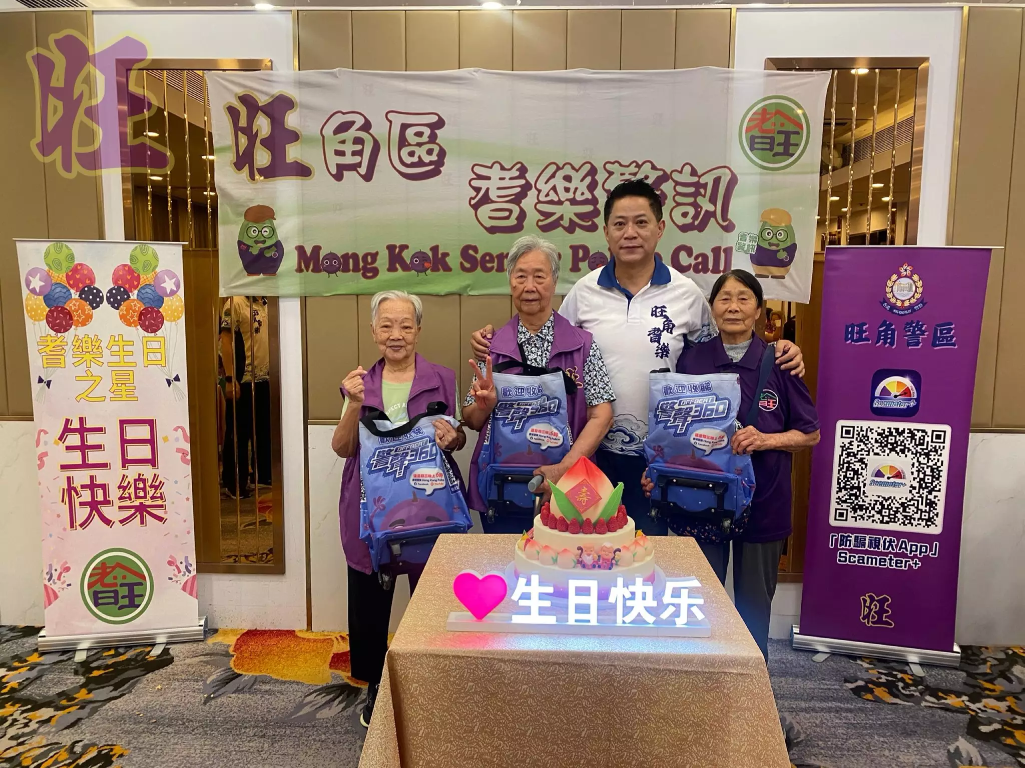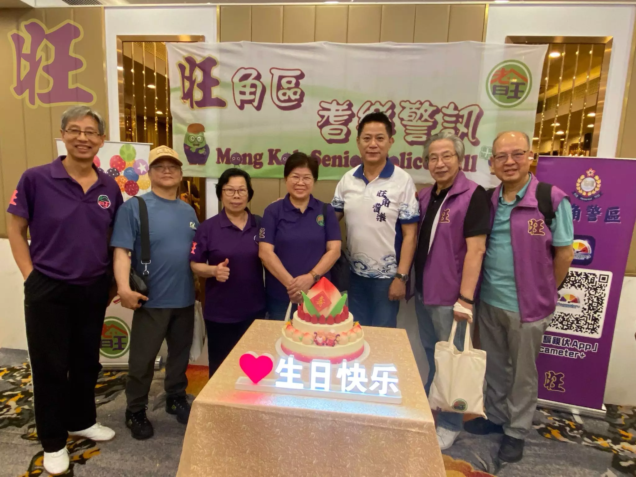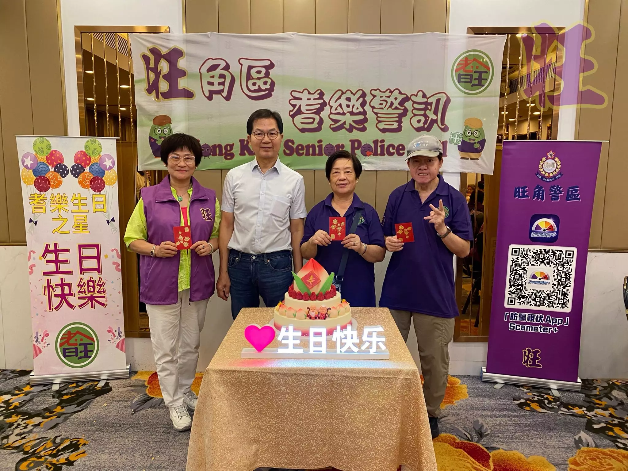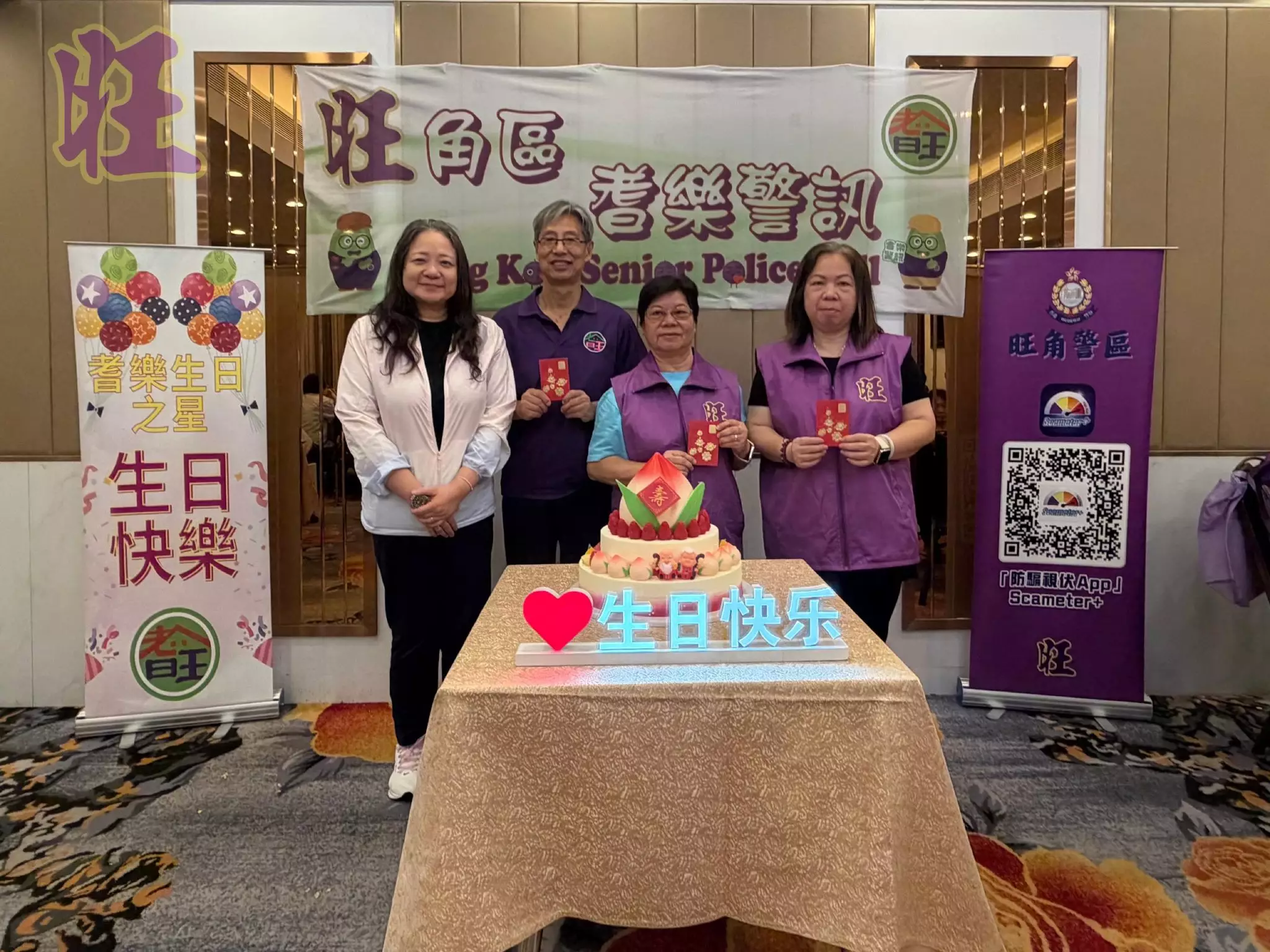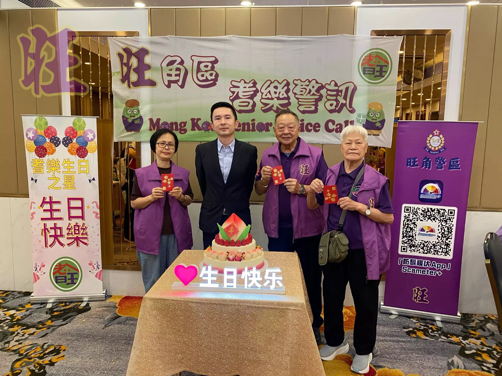 生日會開始前,旺角警區警民關係組利警長向一眾老友記及嘉賓分享最近2宗行騙案件,分析騙徒手法及分享實用預防方法,並介紹了「旺角警區防騙智囊團」。呼籲大家時刻保持警覺。