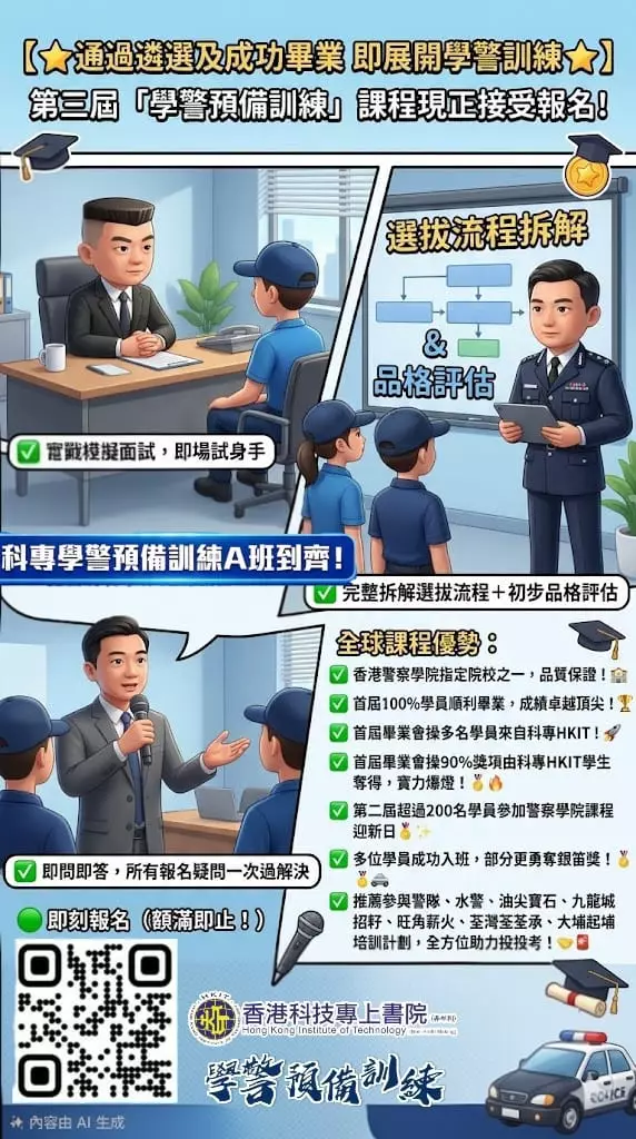 歡迎大家報讀由 #香港科技專上書院(科專HKIT)與「 #警察招募組 」及「 #警察學院 」攜手開辦全新的「#學警預備訓練」課程