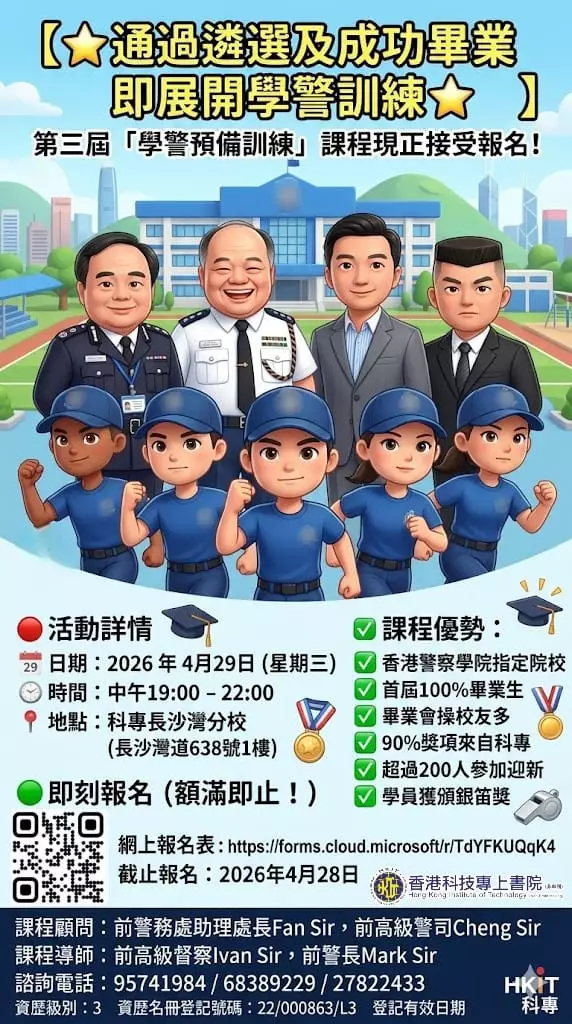 歡迎大家報讀由 #香港科技專上書院(科專HKIT)與「 #警察招募組 」及「 #警察學院 」攜手開辦全新的「#學警預備訓練」課程