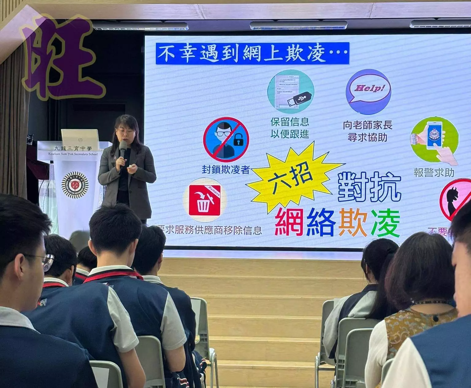 4月22日至23日期間,旺角警區學校聯絡主任施警長走進九龍三育中學,分別為高中及初中同學舉辦防罪專題講座,與同學深入探討校園及網上安全議題。
