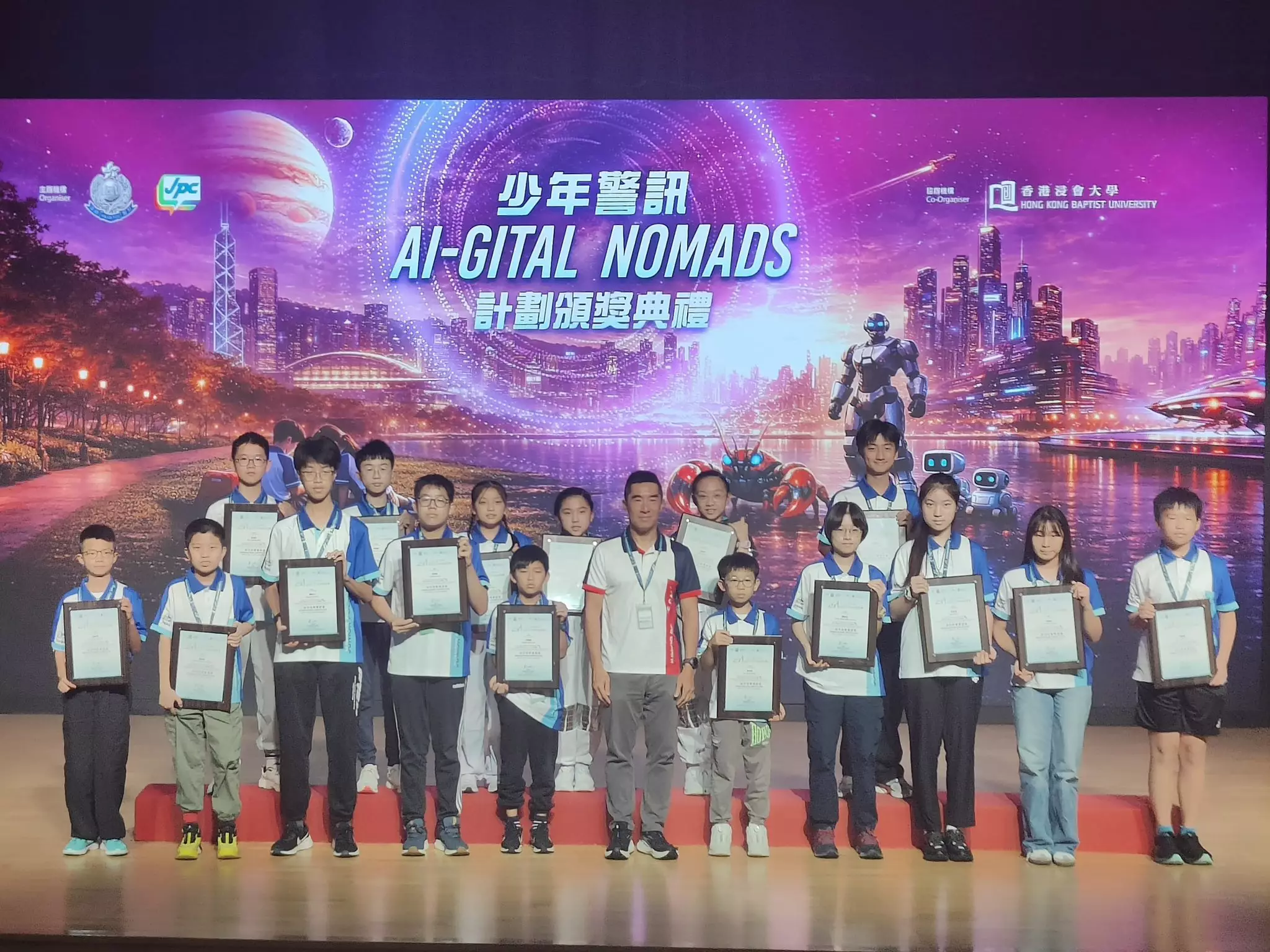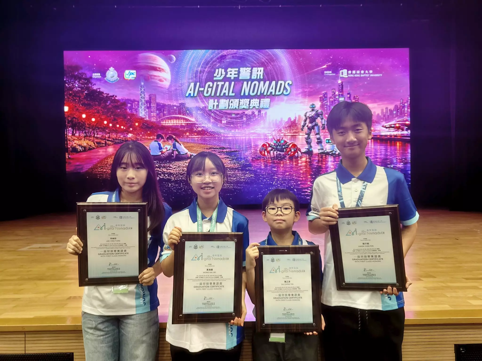 今日4月25日,4名油尖區少年警訊出席在香港浸會大學舉行的少年警訊AI-gital Nomads計劃頒獎典禮,並且獲得一級榮譽畢業證書,他們在這個計劃中獲益良多,除了認識到日常的電腦應用,更能夠探索及開創新思維,並擴闊眼界。