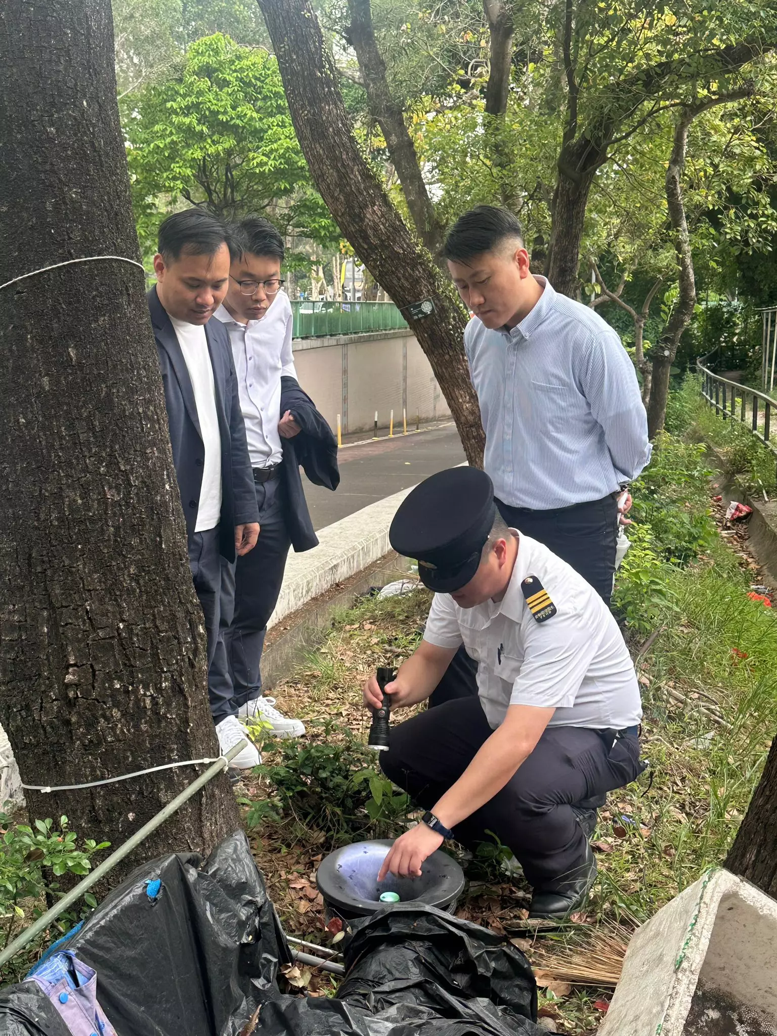 陪同落區視察的包括民建聯區議員曾興隆、吳耀祖、胡景鵬、高維基、柯倩儀及社區幹事賴昊陽,一行人現場聽取食環署人員講解區內滅蚊資源配置及日常防治工作。現時食環署於上水全區設置超過60個滅蚊杯,以及19部滅蚊機,當中包括13部太陽能滅蚊機及6部石油氣滅蚊機,透過多個監測及捕蚊裝置持續管控蚊蟲數量。署方亦固定每星期一、三、五安排霧化噴藥滅蚊,加強滅蚊成效。