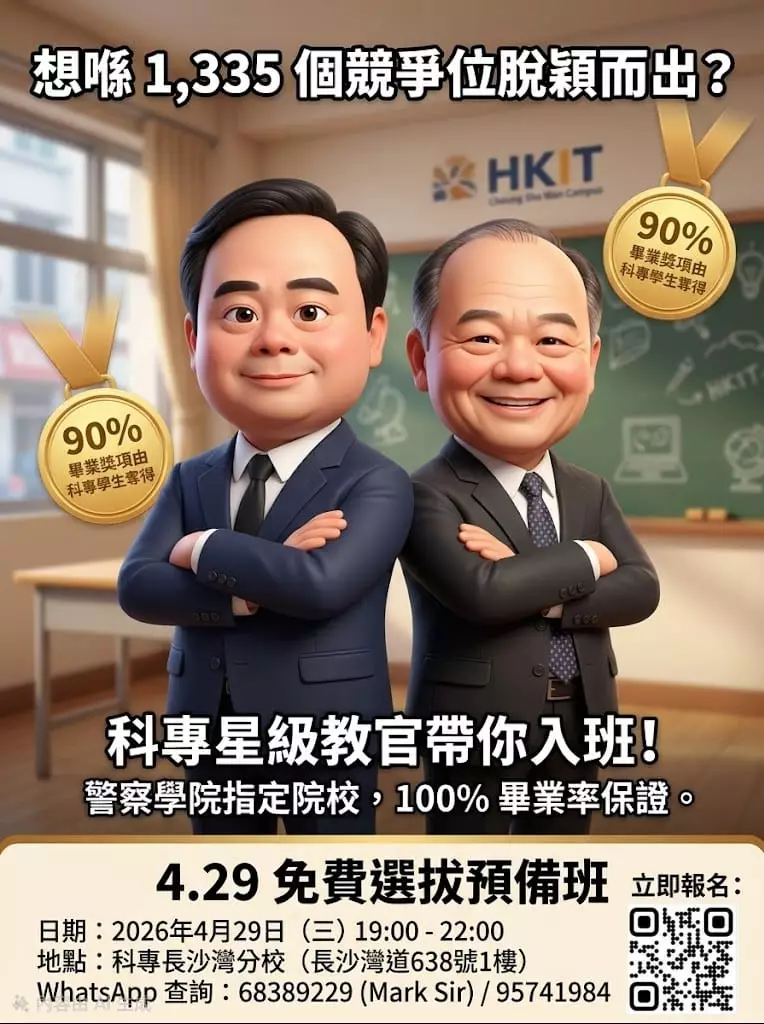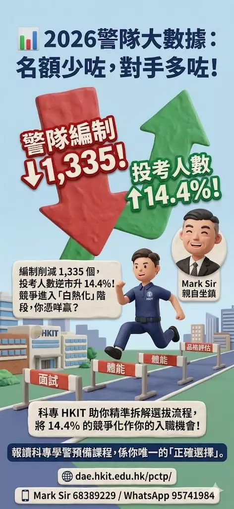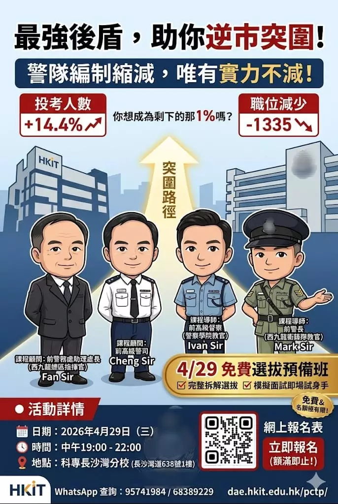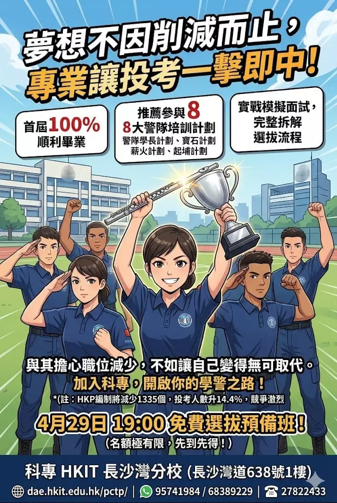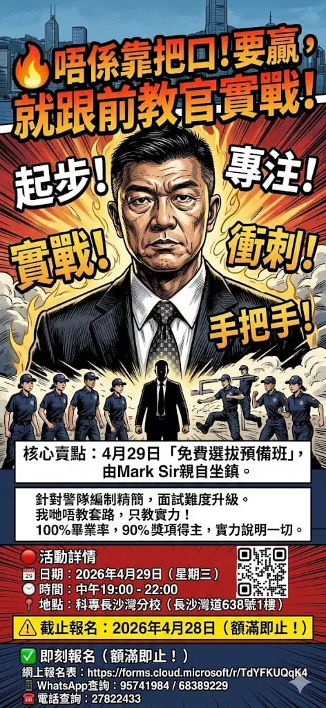 名額有限,為助你一擊即中,科專HKIT特別推出免費「選拔預備班」!由西九龍衝鋒隊前教官Mark Sir親自坐鎮,手把手教你: