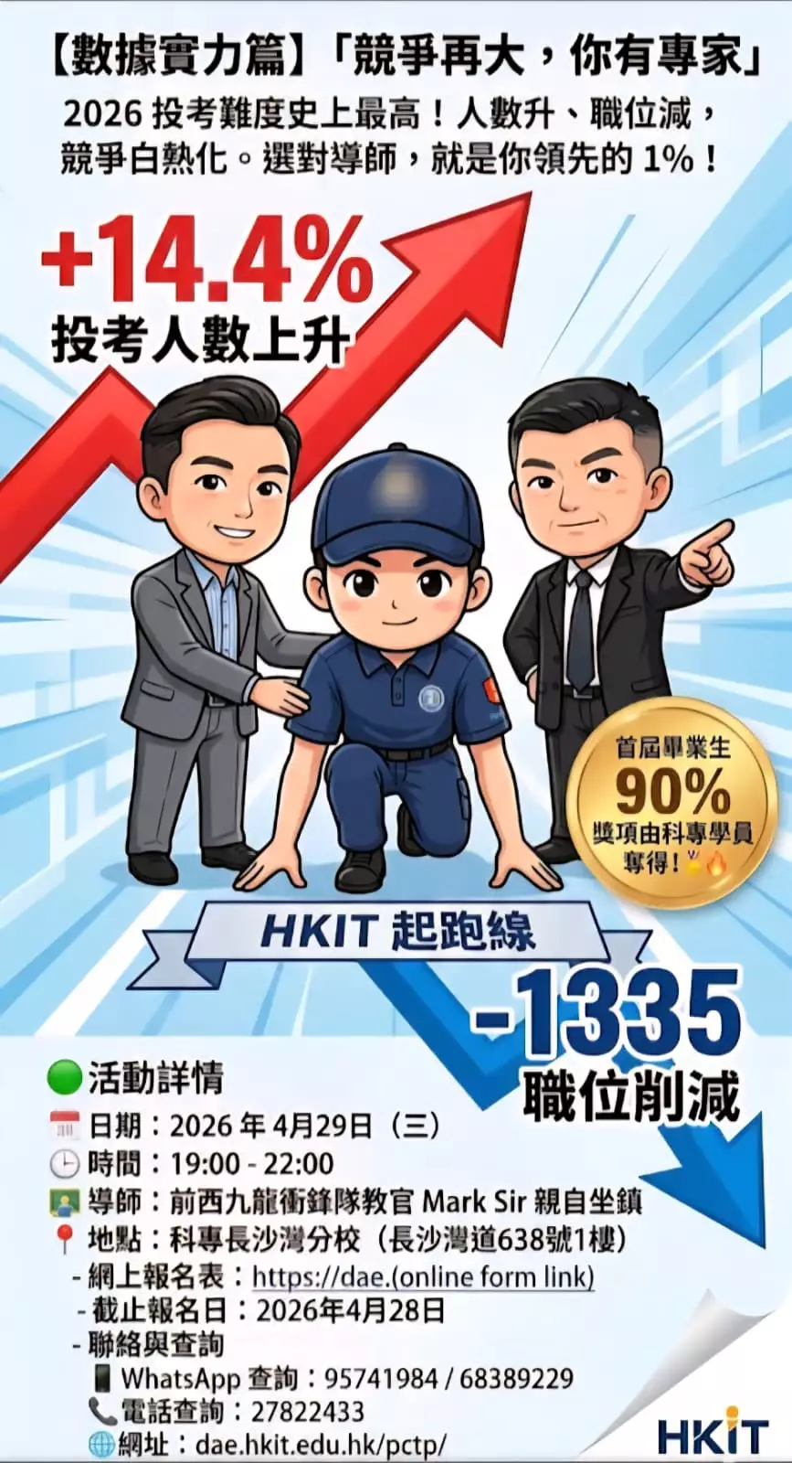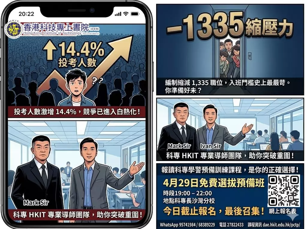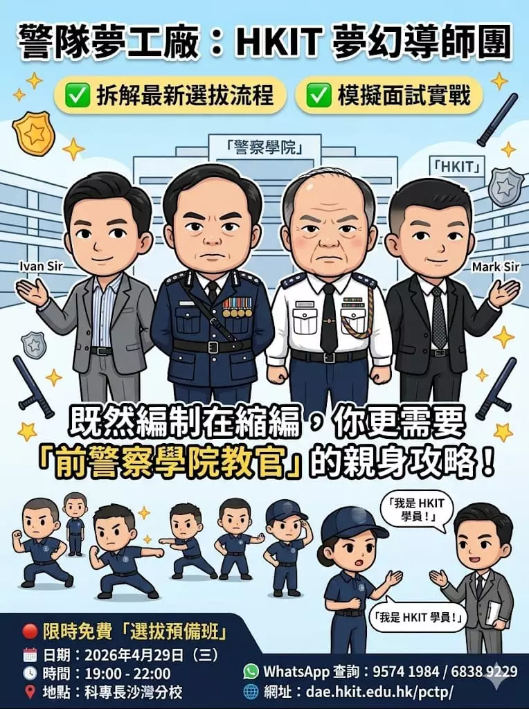 名額有限,為助你一擊即中,科專HKIT特別推出免費「選拔預備班」!由西九龍衝鋒隊前教官Mark Sir親自坐鎮,手把手教你: