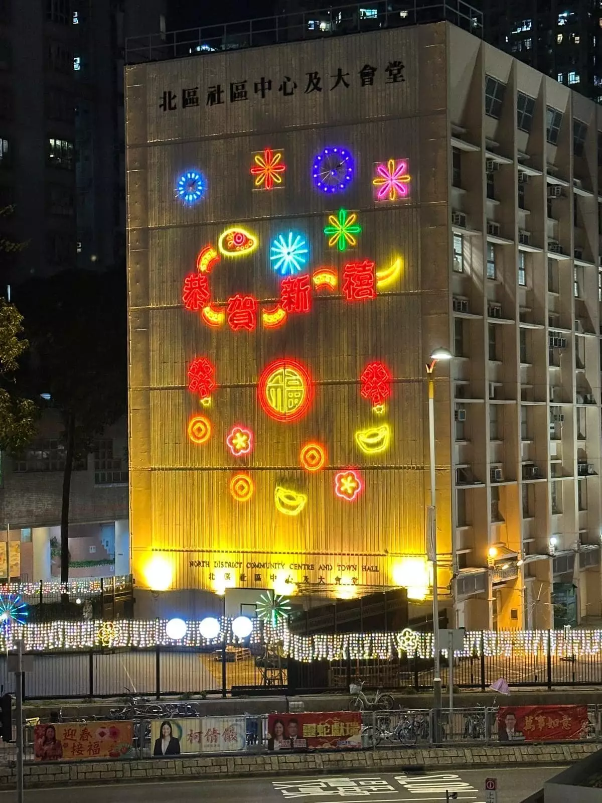 為慶祝蛇年新春,北區民政處喺區內人流暢旺嘅地點,包括上水同粉嶺兩個港鐵站嘅行人天橋、北區大會堂、新運路同沙頭角公路迴旋處、粉嶺遊樂場,仲有上水新康街,布置咗設計新穎嘅賀年燈飾,為北區注入歡樂嘅節日氣氛! 今年嘅燈飾布置加入咗唔同嘅節慶元素,例如大家喺北區大會堂可以睇到閃動嘅煙花,夜夜璀璨;喺上水新康街就會見到唔同嘅賀年圖案同埋一對可愛嘅蛇仔盤旋夜空;粉嶺天橋有喜氣洋洋嘅舞龍舞獅;粉嶺遊樂場就有翩翩起舞嘅發光金蛇,大家喺北區隨處都可以感受到新年嘅喜悅同盡情打卡啦!