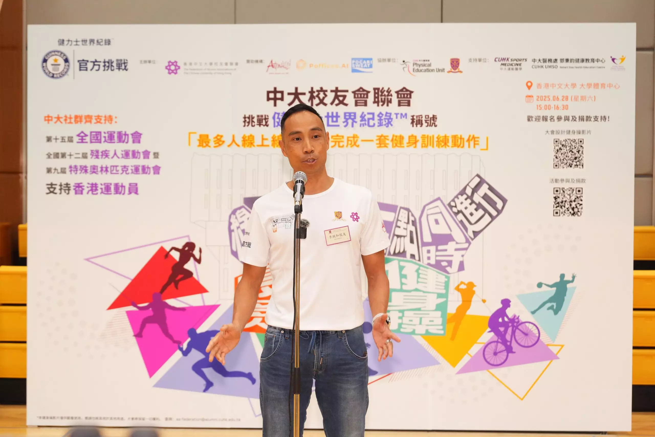 中大校友會聯會會長李致和博士(99 逸夫體育運動科學、13 研究院教育、19 研究院教育博士、24 研究院高級工商管理碩士) 對成功創下世界紀錄感到非常振奮,他表示:「感謝每一位在活動中參與及支持的校友、老師及同學,為中大社群的齊心及正能量感到自豪!這次活動不僅是一次健身訓練,更能喚起香港社會尤其是中大社群對運動的支持,通過活動傳遞正能量,鼓勵更多人參與運動,發揚健康生活的理念。運動的普及與推廣,能有效提升市民的身體素質和生活質量,進一步促進社會的和諧與發展。 」