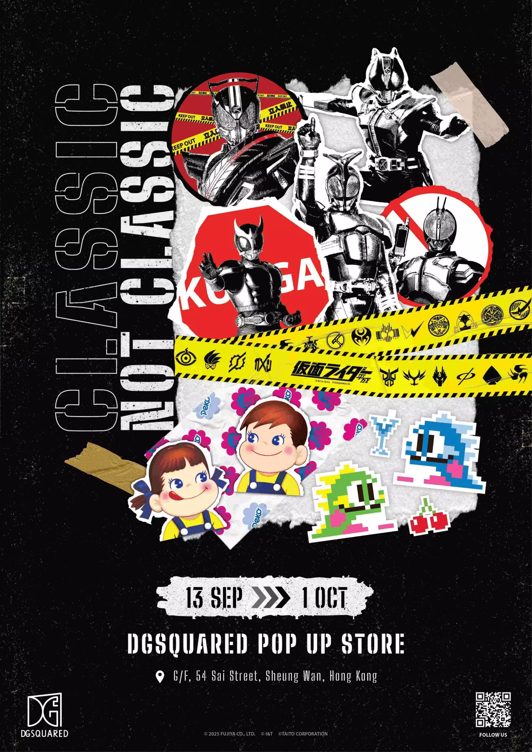 DGSQUARED集合多樣化的潮流及經典IP以及致力引進有潛力的藝術家,共同開發潮流玩具和型格別緻的產品,讓藝術融入生活之中。由9月13日至10月1日,DGSQUARED以「CLASSIC NOT CLASSIC」為主題,於上環西街54號首設期間限定店,結集一眾經典IP,推出全新概念產品,為經典IP帶來嶄新形象。當中包括平成時代幪面超人系列,更有經典電玩IP泡泡龍及香港人的糖果回憶IP牛奶妹。