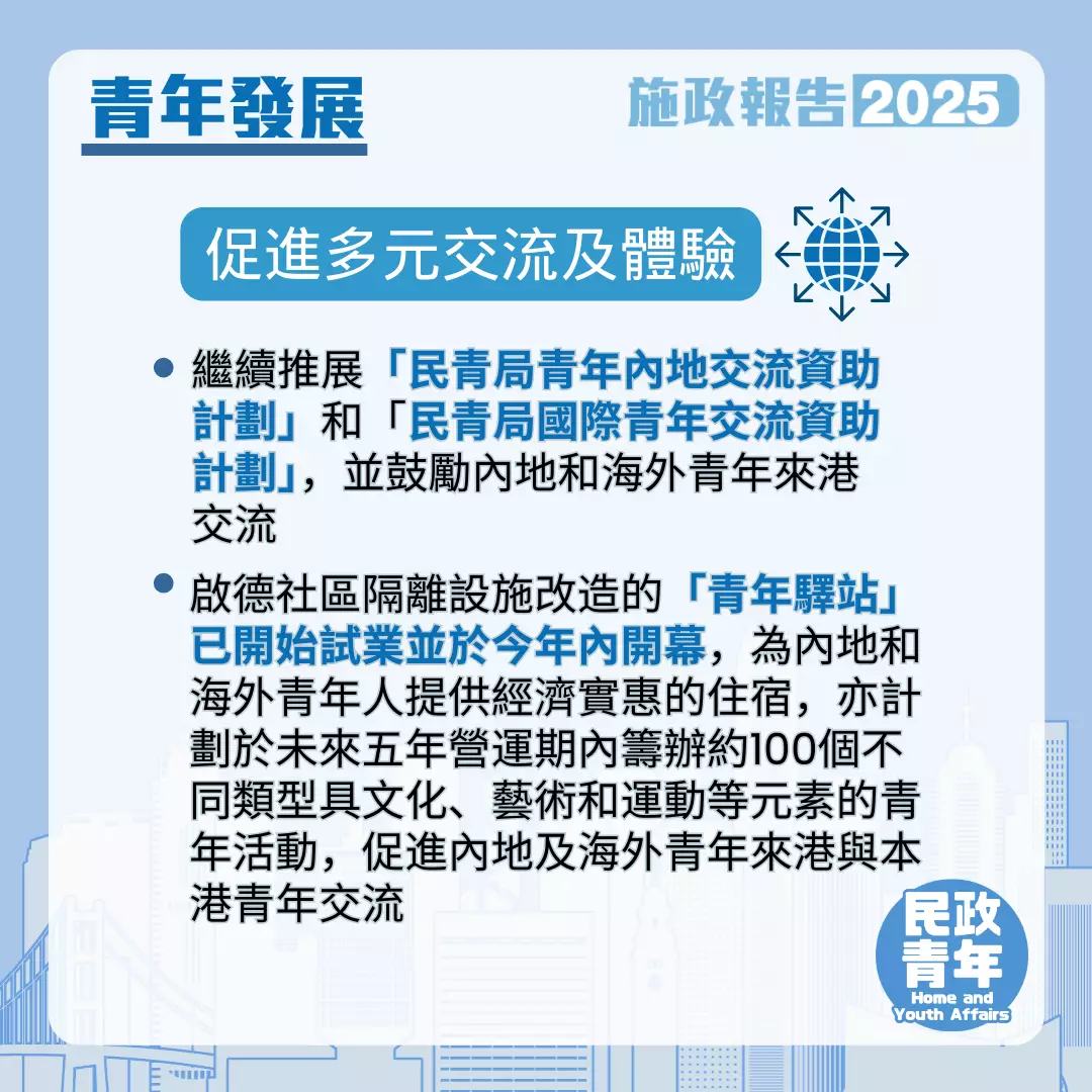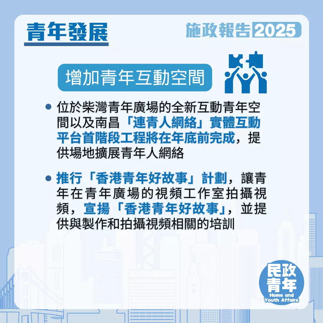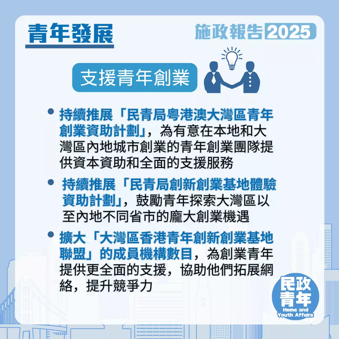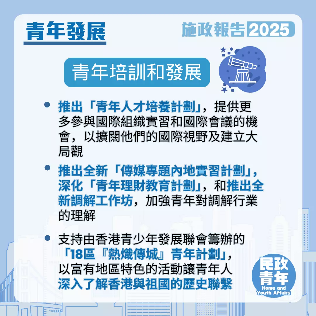 2025年施政報告今天出爐,民青局在青年發展方面的重點工作包括: