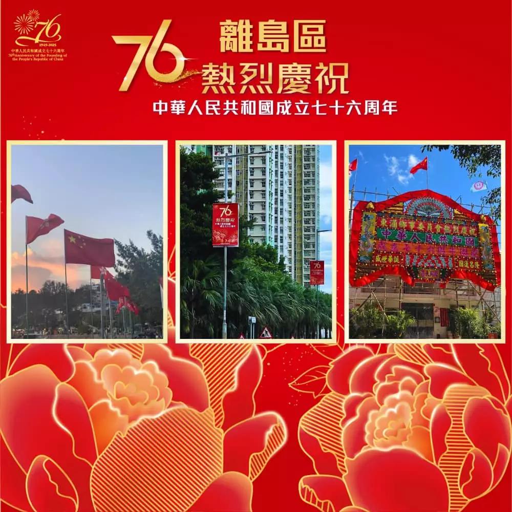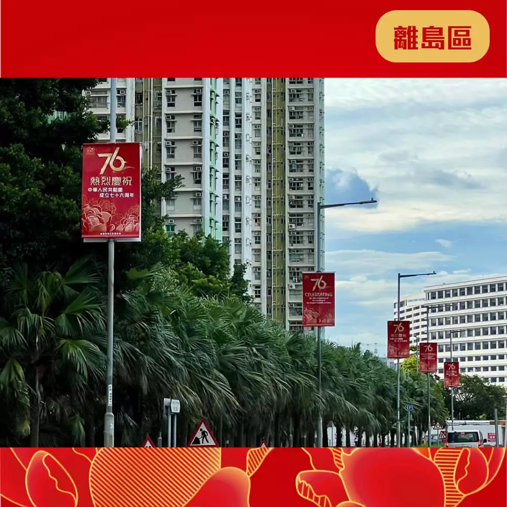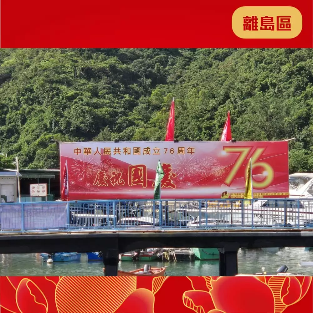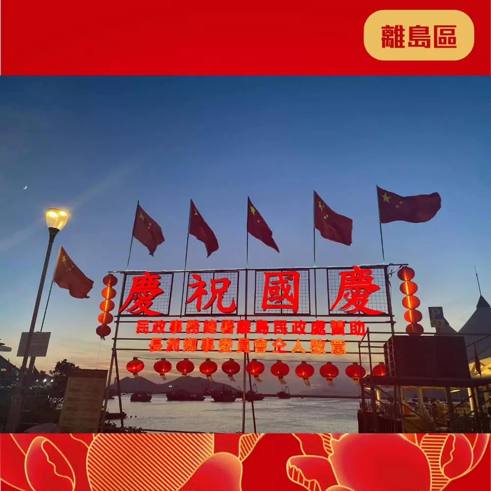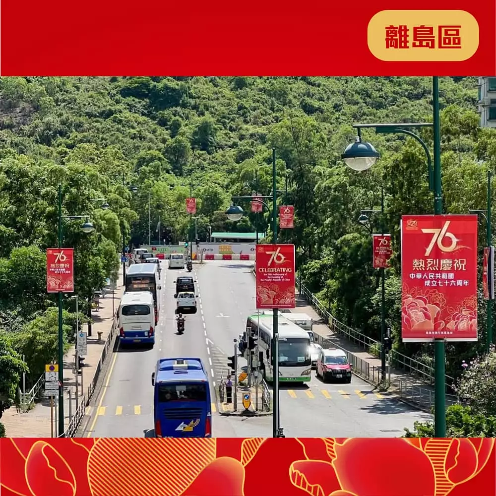 離島民政處聯同地區團體已經喺區內展示各種絢麗奪目嘅國慶宣傳品同裝飾 ,當中包括燈柱彩旗、花牌及海報等,為社區注入濃厚的國慶喜慶氛圍 ,齊齊與民慶祝國慶
