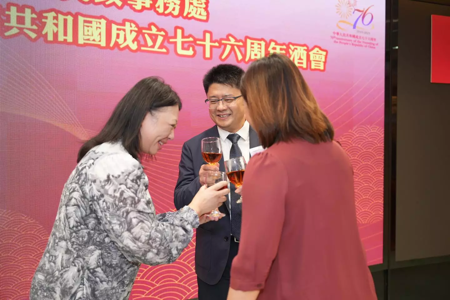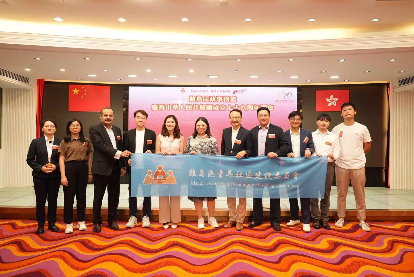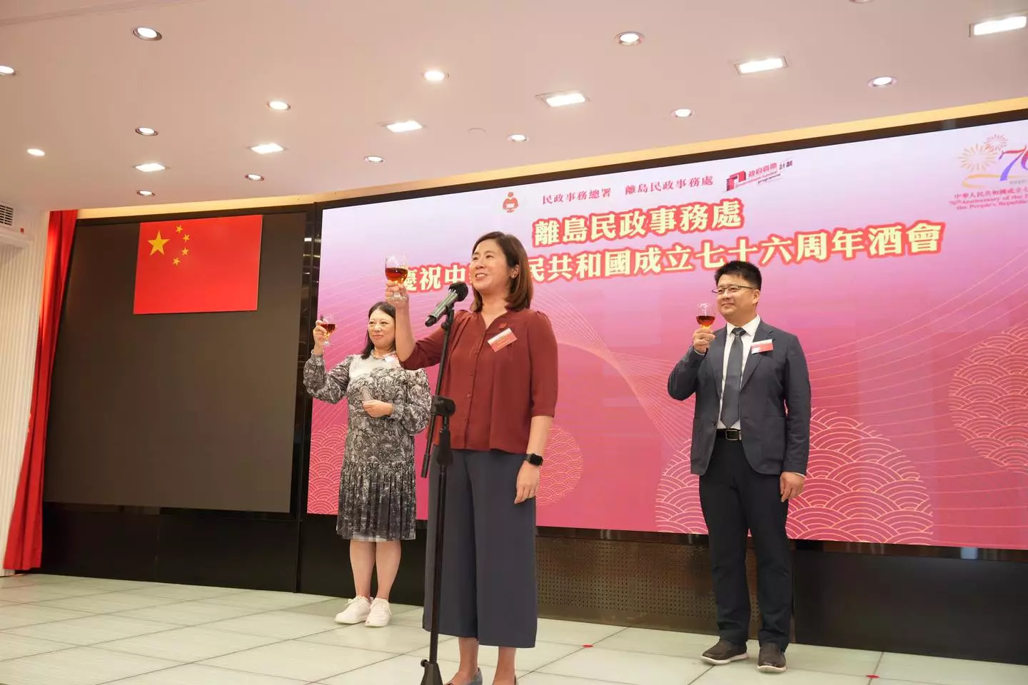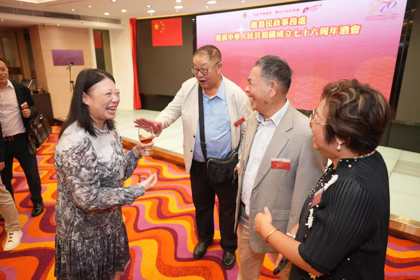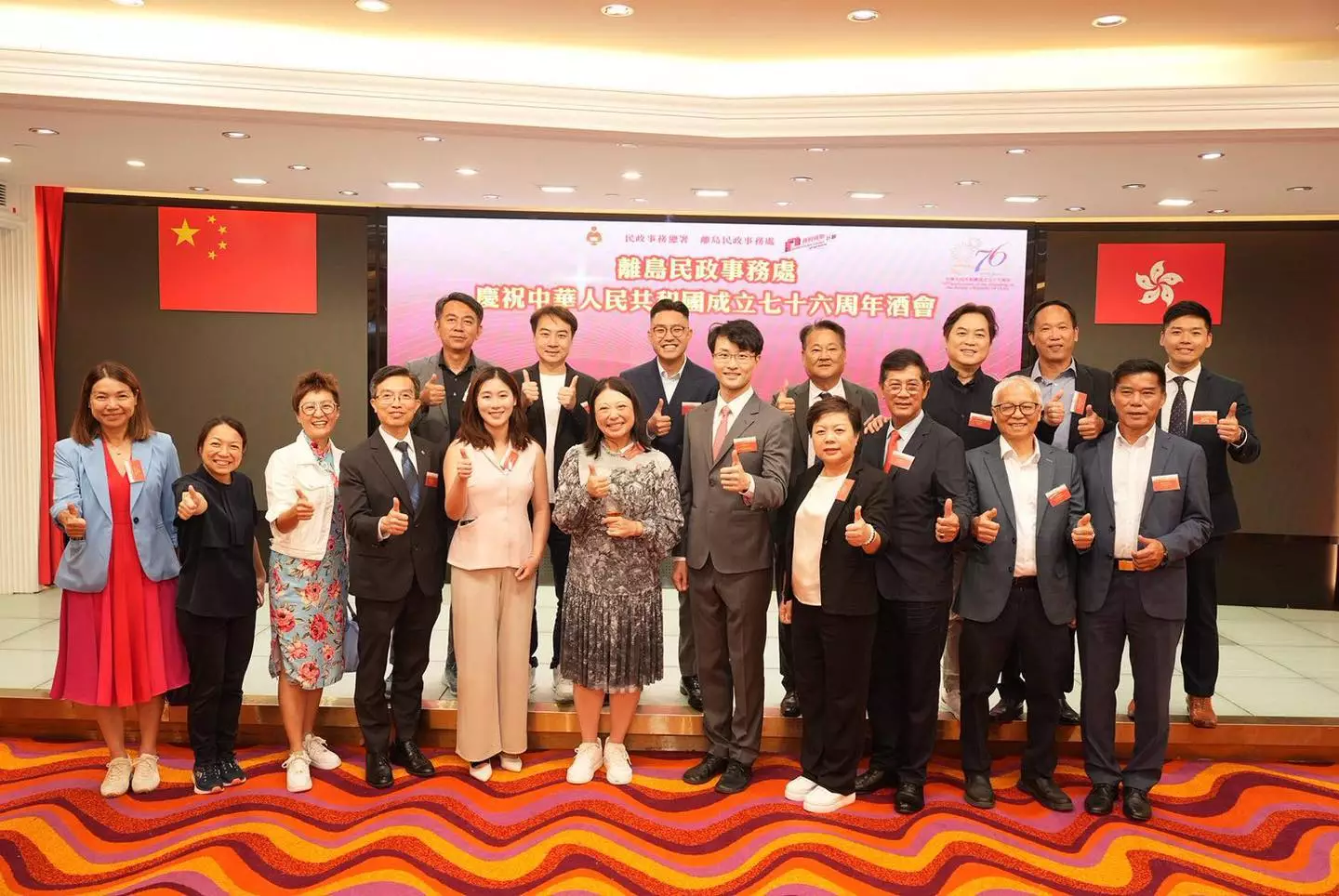離島民政處喺26/9舉行「慶祝中華人民共和國成立76周年酒會」 ,民政總署副署長王婉蓉、中聯辦新界工作部副部長王卉、離島民政專員楊蕙心,仲有一眾地區領袖、社會賢達同埋政府部門代表聚首一堂,大家齊齊賀國慶 。