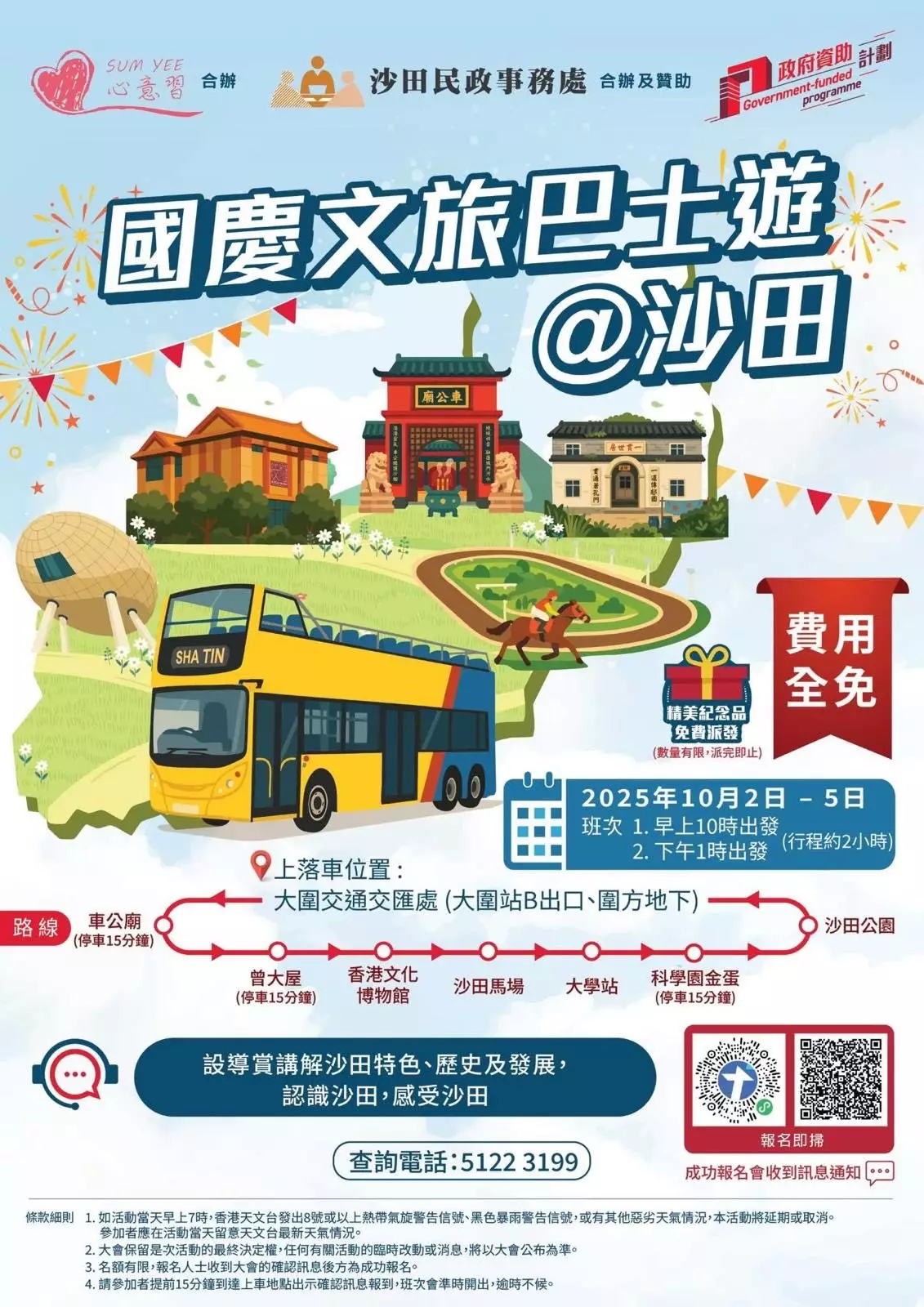 「國慶文旅巴士遊 @沙田」將於10月2日至5日期間共8班車,報名反應踴躍 ,部分班次仲有少量名額,有興趣嘅市民或旅客可以掃一掃海報上面嘅QR code報名 !