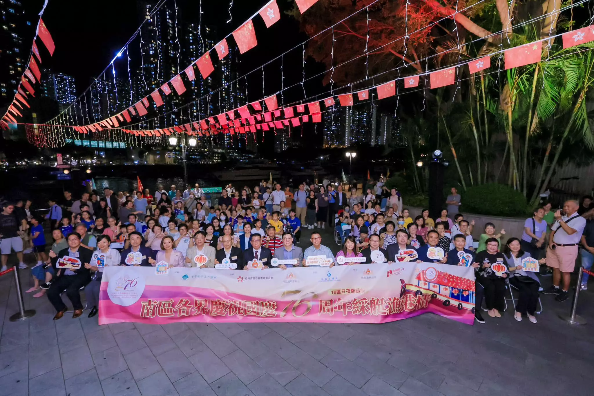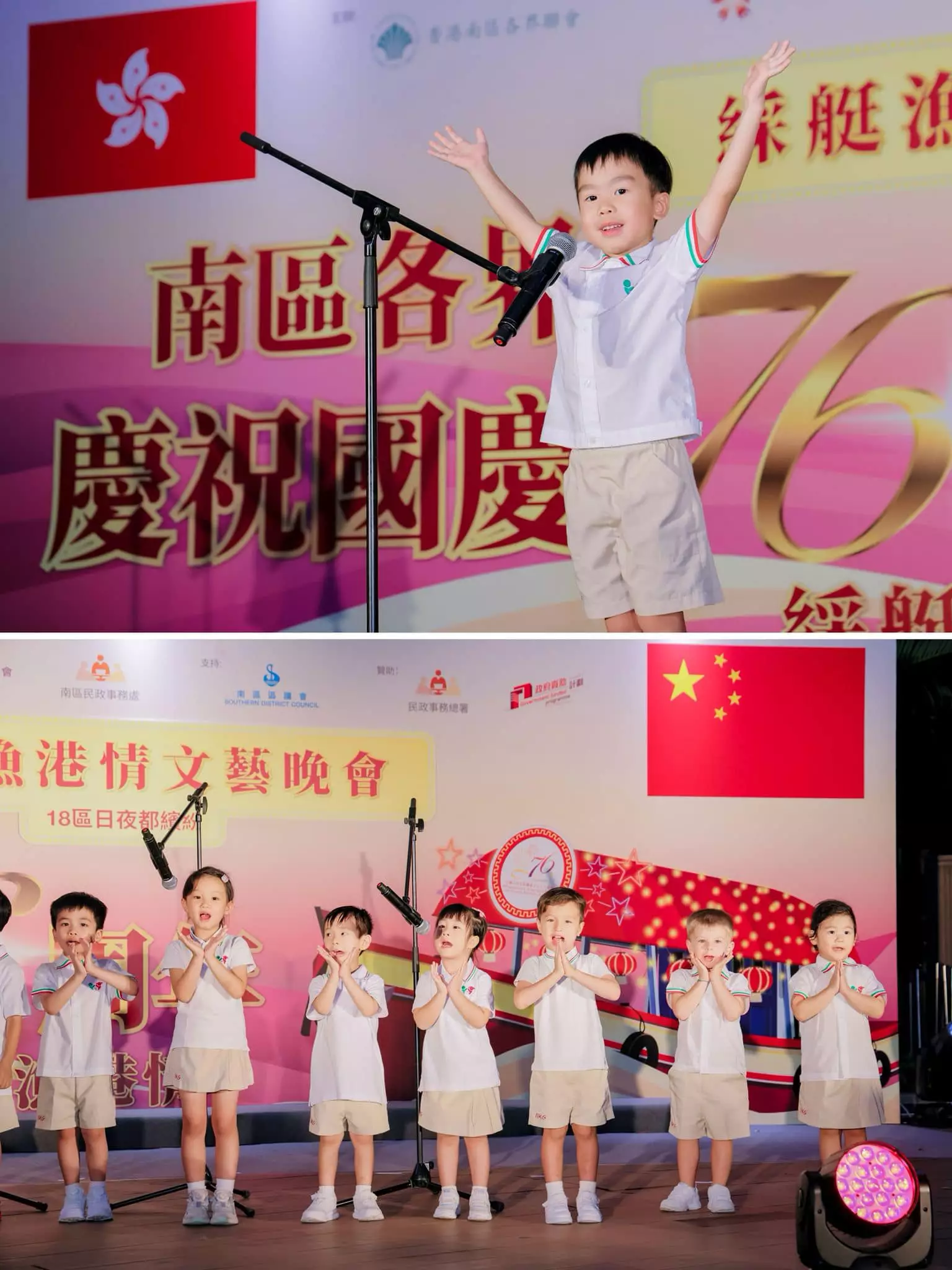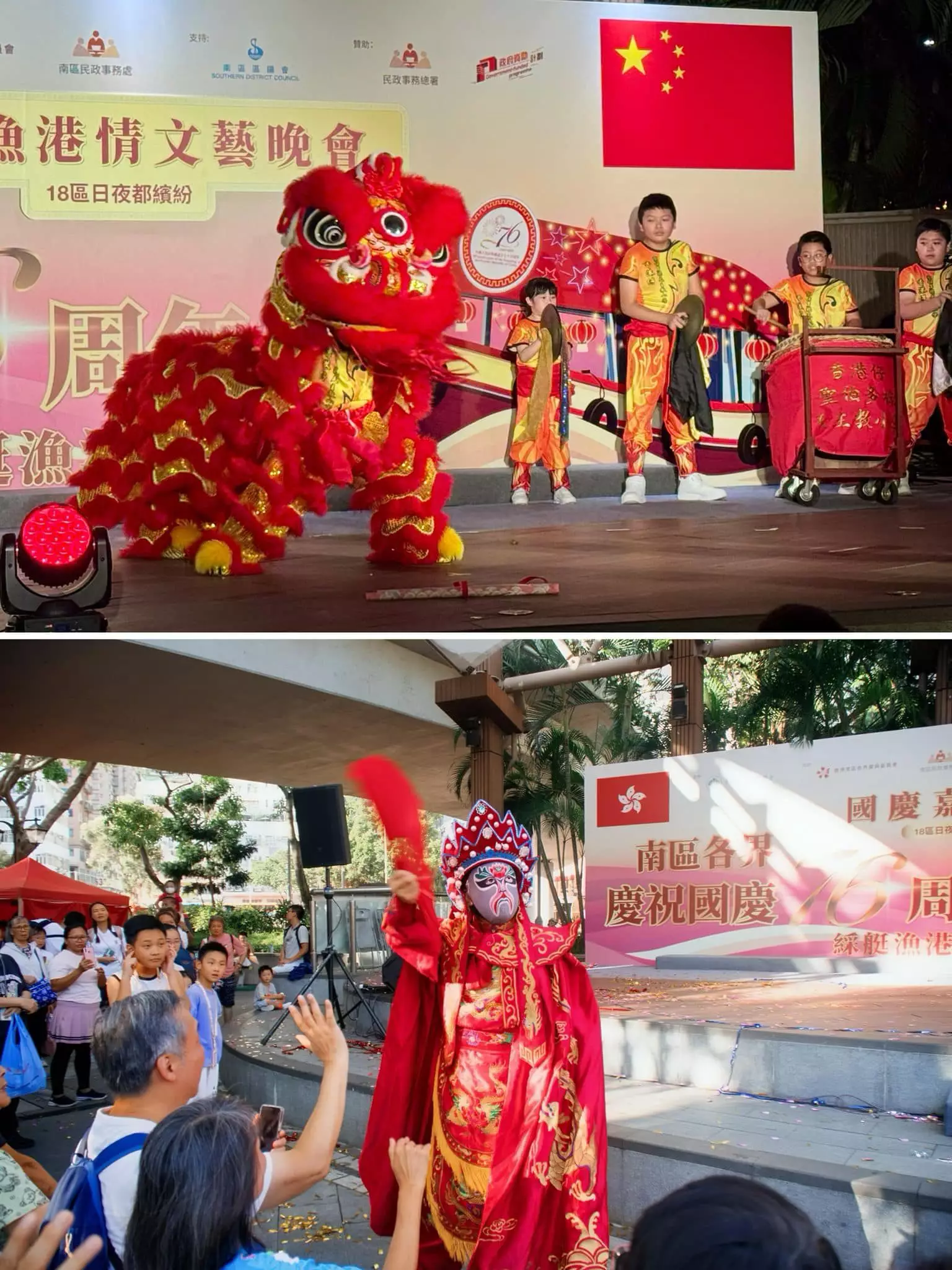 南區各界聯會、慶典委員會與南區民政處為慶祝國慶七十六周年,於九月二十九日舉辦文藝晚會。中聯辦港島工作部副部長楊成偉、南區民政專員張佩珊及立法會議員等嘉賓出席活動,共同為慶祝活動揭開序幕。 晚會節目豐富多彩,表演者載歌載舞,現場氣氛熱烈。其後參加者分批乘坐裝飾璀璨的傳統綵艇,遊覽香港仔避風塘,體驗南區獨特的漁港風情,回顧地區歷史文化。 國慶日當天,行政會議召集人葉劉淑儀、中聯辦港島工作部副處長黃鵬舉、南區民政助理專員陳芷羚與各界嘉賓為國慶嘉年華主持開幕禮。現場設有多個攤位遊戲和表演節目,吸引眾多家庭參與,家長與小朋友共度歡樂時光。