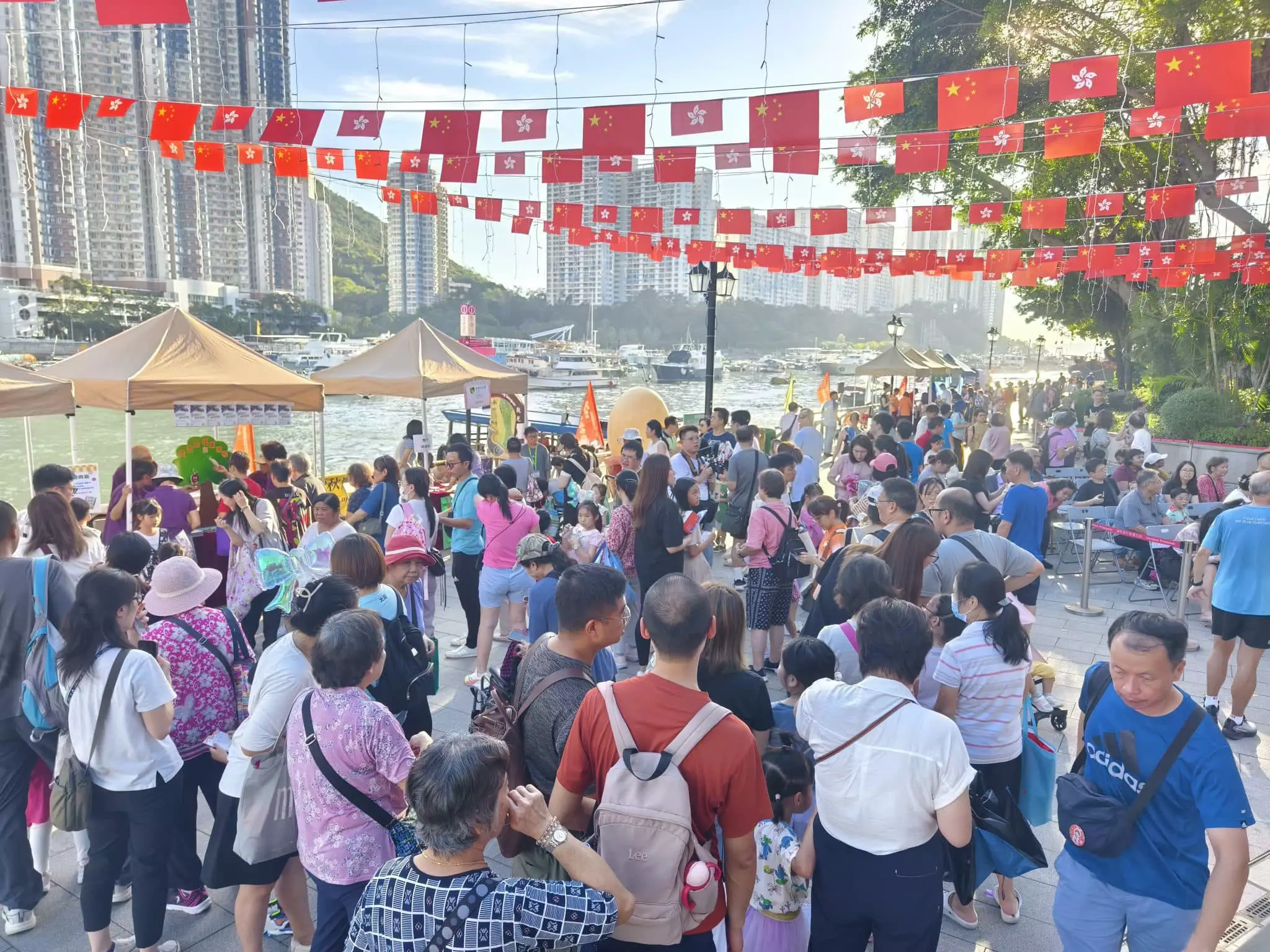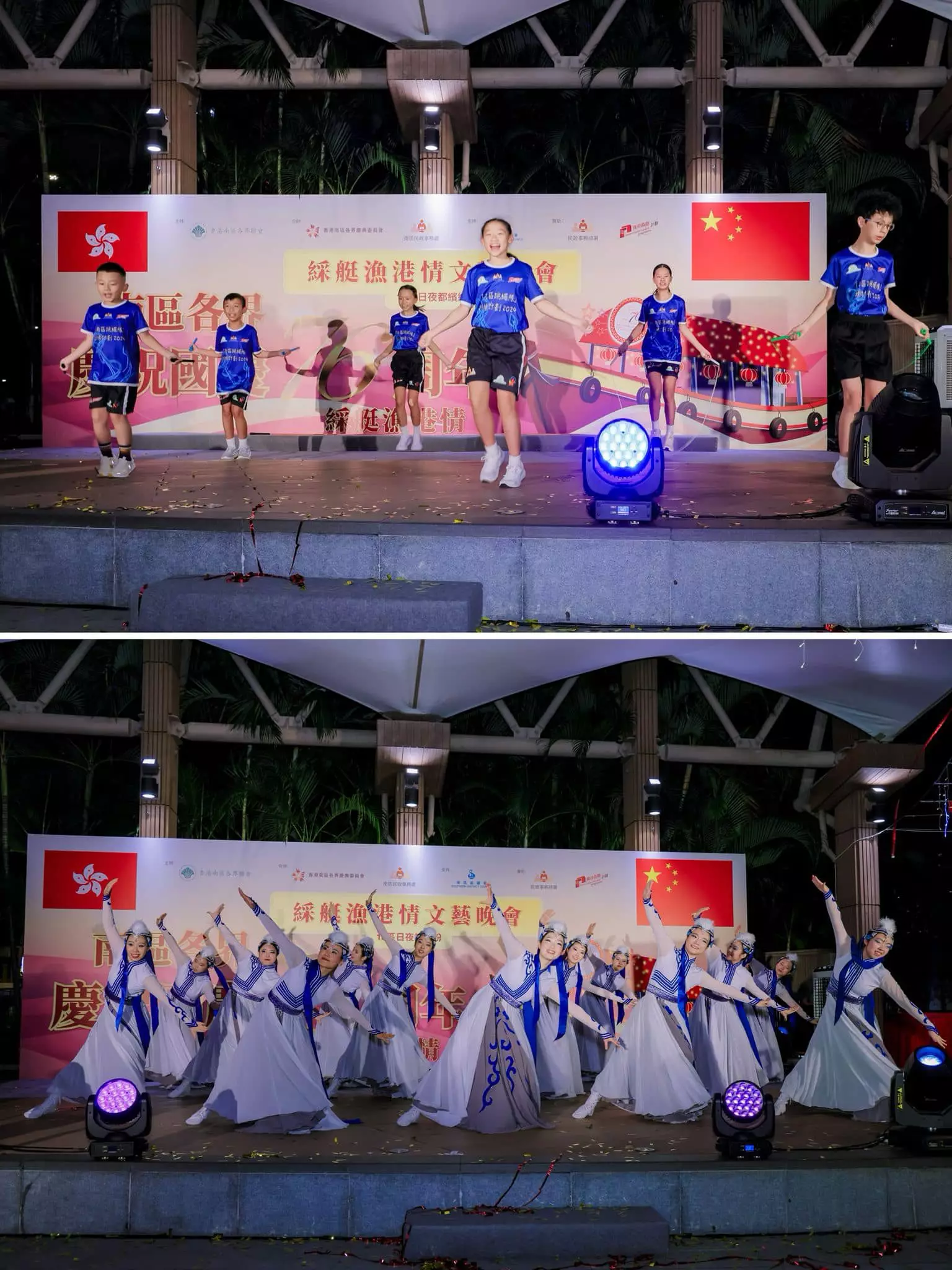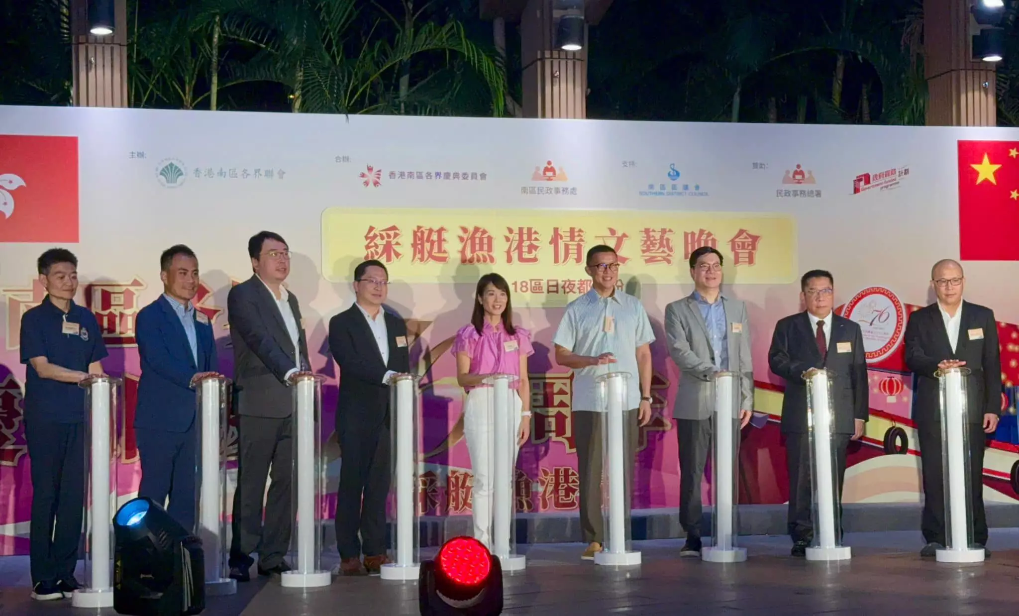 南區各界聯會、慶典委員會與南區民政處為慶祝國慶七十六周年,於九月二十九日舉辦文藝晚會。中聯辦港島工作部副部長楊成偉、南區民政專員張佩珊及立法會議員等嘉賓出席活動,共同為慶祝活動揭開序幕。 晚會節目豐富多彩,表演者載歌載舞,現場氣氛熱烈。其後參加者分批乘坐裝飾璀璨的傳統綵艇,遊覽香港仔避風塘,體驗南區獨特的漁港風情,回顧地區歷史文化。 國慶日當天,行政會議召集人葉劉淑儀、中聯辦港島工作部副處長黃鵬舉、南區民政助理專員陳芷羚與各界嘉賓為國慶嘉年華主持開幕禮。現場設有多個攤位遊戲和表演節目,吸引眾多家庭參與,家長與小朋友共度歡樂時光。