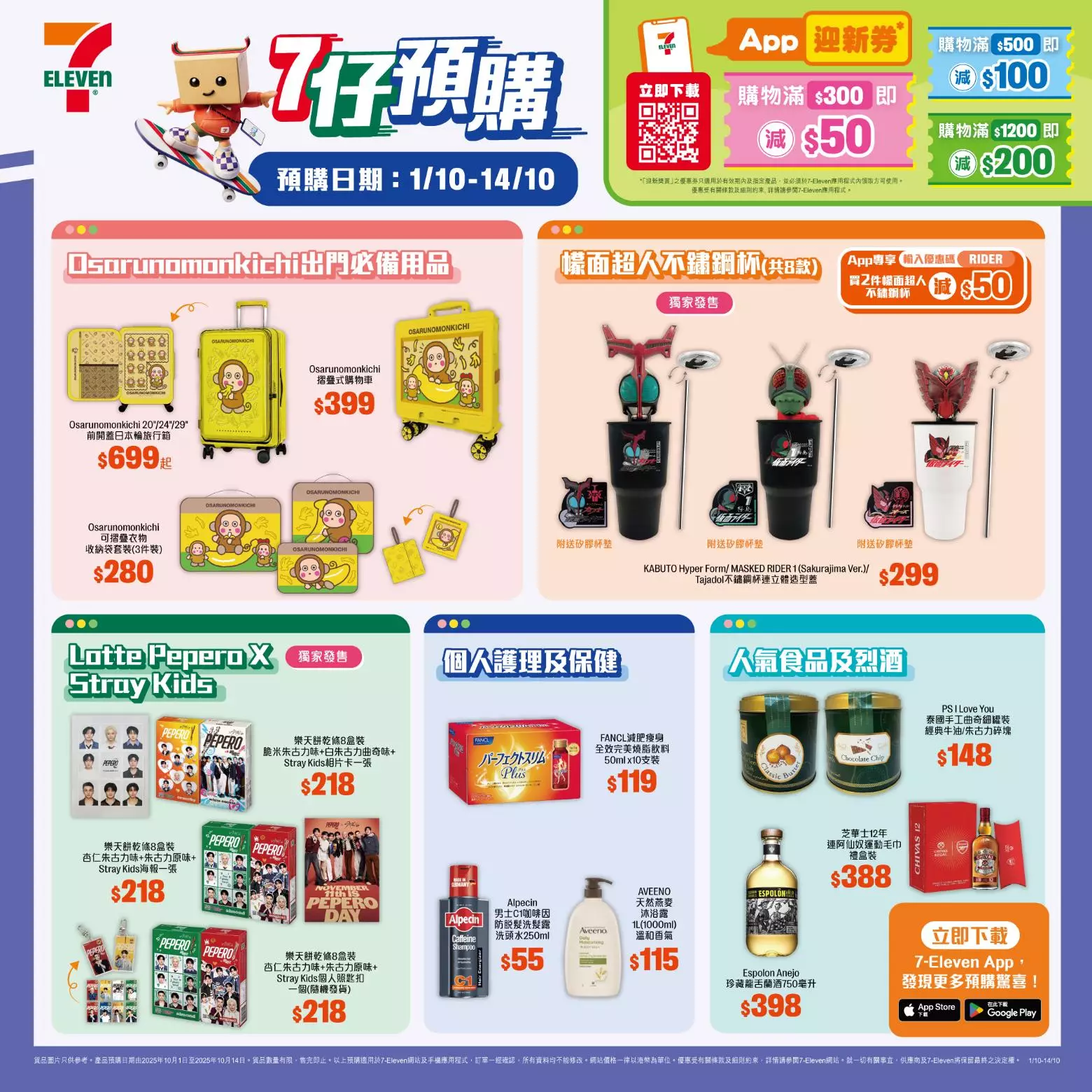 今次「7仔預購」另一驚喜預購必搶 —— 幪面超人不鏽鋼杯連立體造型蓋!共8款型格杯身搭配搶眼幪面超人立體頭像杯蓋,無論自用還是精品擺設都極具收藏價值。同場還有超人氣韓國 樂天餅棒 x Stray Kids專屬周邊組合預購,無論是動漫迷還是韓流控均可一次滿足。今期「7 仔預購」將於 10月 1日開始在「7 仔預購」網站 (https://www.7-eleven.com.hk/) 及 7-Eleven App (下載連結: https://qr1.be/XLQF) 雙平台開放預購。各位千萬不要錯過,一起搶購心水產品。