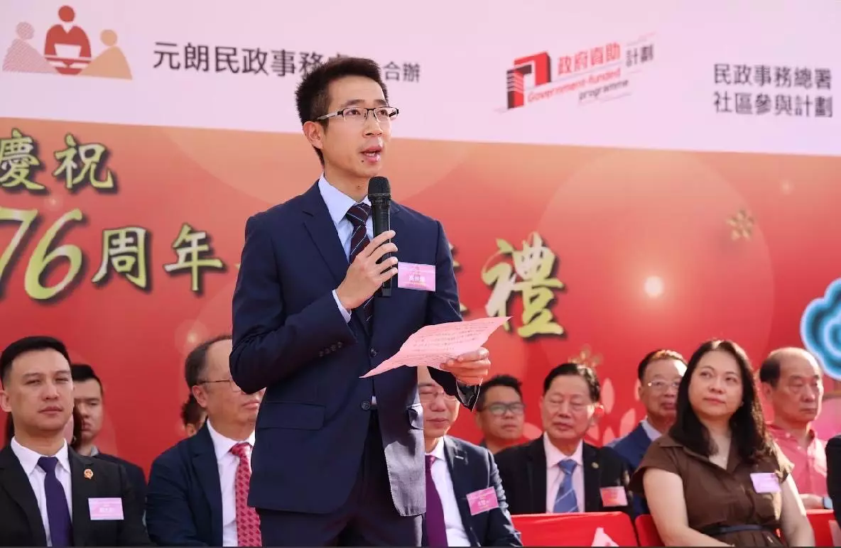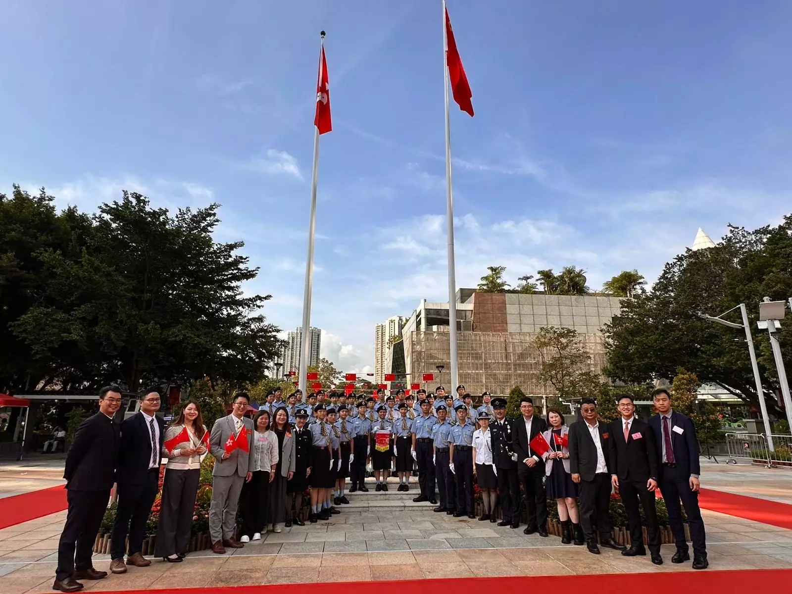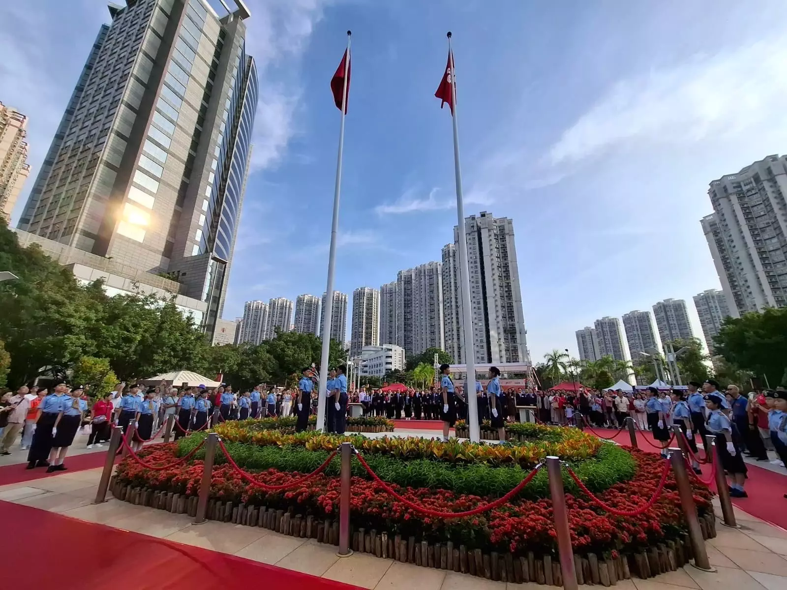1/10上午喺天水圍銀座廣場 舉行,由中聯辦新界工作部副處長龐杰釗、港區全國政協委員呂堅及梁志祥、地區服務及關愛發展基金(元朗)主席李聖根、元朗民政助理專員高倬煒等擔任主禮嘉賓。典禮場面 莊嚴肅穆,奏唱國歌時隨著國旗同區旗徐徐升起,共同 祝願祖國國泰民安 、香港繁榮昌盛 、元朗政通人和 。