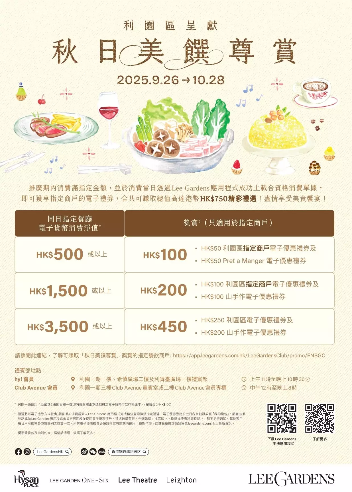 除此,推廣期內於指定餐廳消費滿指定金額,並於消費當日透過Lee Gardens應用程式成功上載合資格消費單據,即可獲享指定商戶的電子禮券,合共可賺取總值高達港幣$750精彩禮遇,馬上熟讀賺盡現金獎賞攻略,以最優惠價錢盡情享受這場美食饗宴!
