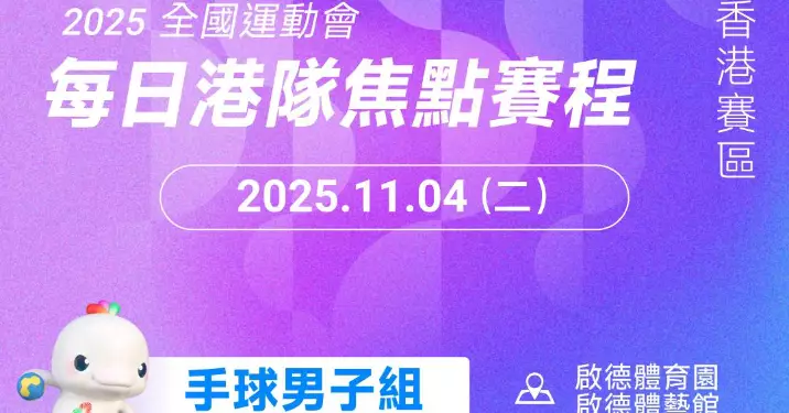 #十五運會沙灘排球(小組賽) 香港維多利亞公園 20:00 – 21:00 女子E組 ─ 杜詠彤/杜詠雯(香港一隊) 曹舒婷/董颉(山東一隊) #十五運會手球男子組(小組賽) 啟德體育園——啟德體藝館 20:00 - 21:30 A組 ─ 香港 澳門 立即購票,一齊撐港隊:https://ticket.baygames.cn/hant/ 立即Follow Facebook專頁和瀏覽專題網站 2025nationalgames.gov.hk,了解更多十五運會和殘特奧會(香港賽區)的最新資訊!