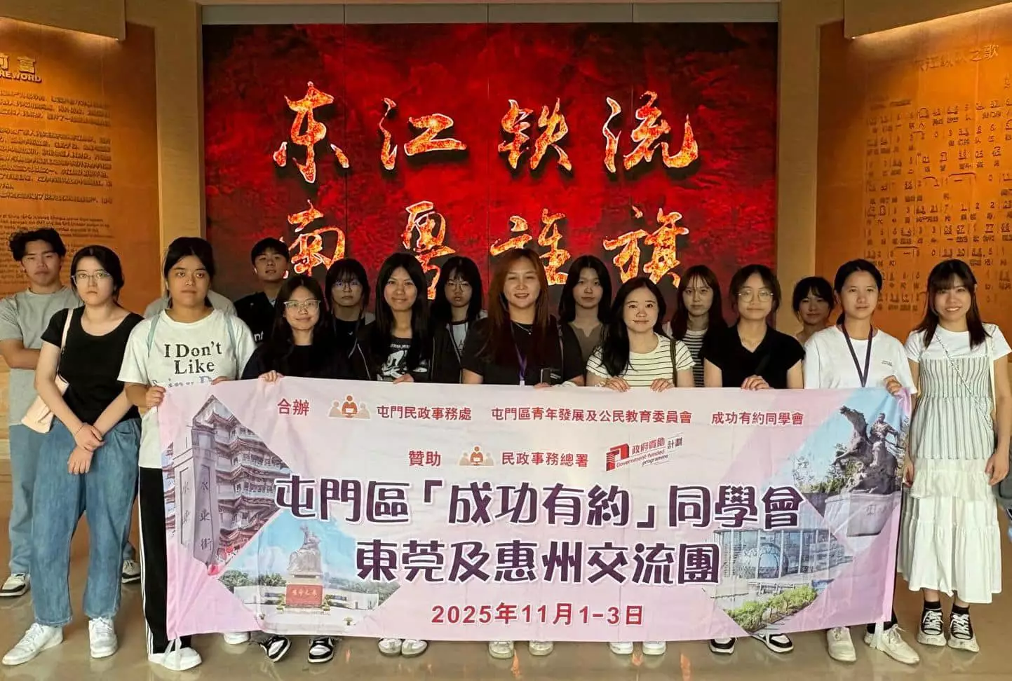 屯門民政處、屯門區青年發展及公民教育委員會聯同「成功有約」同學會,喺11月1至3日舉行咗「屯門區青年東莞及惠州交流團」,參加者包括歷屆屯門區「成功有約」同學會嘅年輕成員同埋其他屯門區嘅青年人。