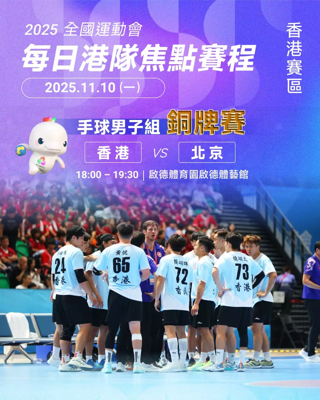 香港男子手球隊將於11月10日下午6:00迎戰北京隊,爭奪全運會銅牌! 十五運會手球男子組銅牌賽 啟德體育園——啟德體藝館 18:00 – 19:30 ─ 香港 北京 立即FollowFacebook專頁和瀏覽專題網站 2025nationalgames.gov.hk,了解更多十五運會和殘特奧會(香港賽區)的最新資訊!