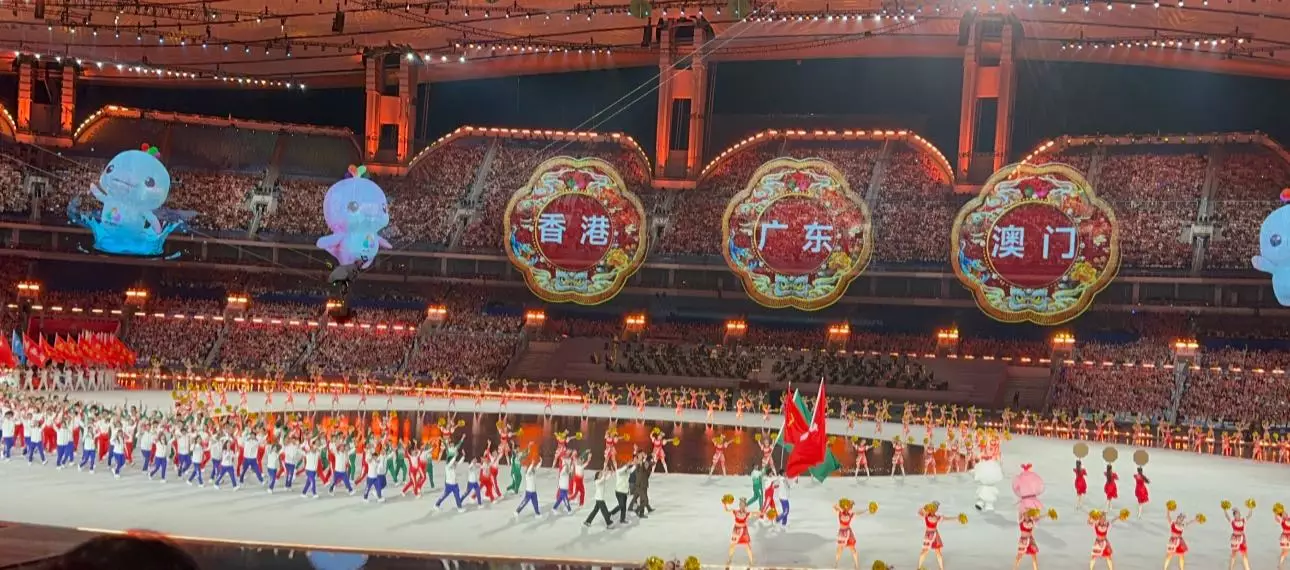 內容:開幕式的文體展主題為《圓夢未來》,以「同心圓」為演繹粵港澳「三地同心」發展大灣區的理念,而以「同根同源」、「同心同緣」和「同夢同圓」三個演出篇章,緊扣主題。文體演亦將粵港澳三地同屬的嶺南文化,通過粵劇、醒獅、武術、英歌等演出,展現給全國觀眾,自然巧妙地展現了灣區的獨特魅力。