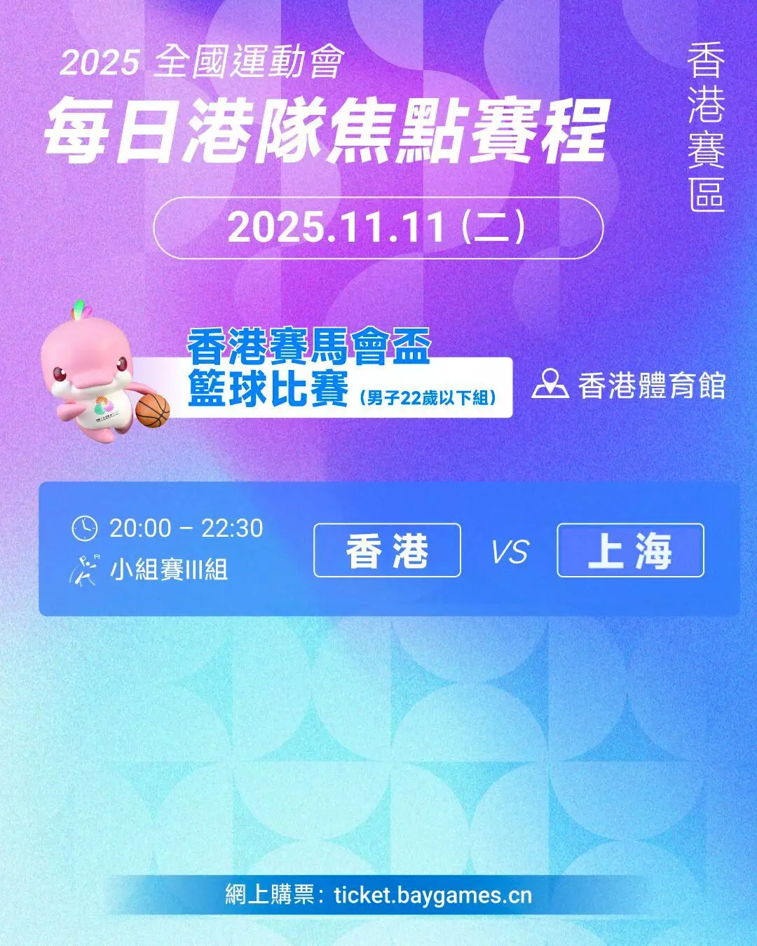 連結已複製! 香港賽馬會盃籃球(男子22歲以下組)比賽已經展開,港隊將於明天(11/11)晚上8:00首次亮相紅館! 十五運會香港賽馬會盃籃球(男子22歲以下組)比賽小組賽III組 香港體育館(紅館) 20:00 – 22:00 ─ 香港 上海 門票熱賣中!立即購票:https://ticket.baygames.cn/hant/...... 立即Follow我們的Facebook專頁和瀏覽專題網站 2025nationalgames.gov.hk,了解更多十五運會和殘特奧會(香港賽區)的最新資訊!