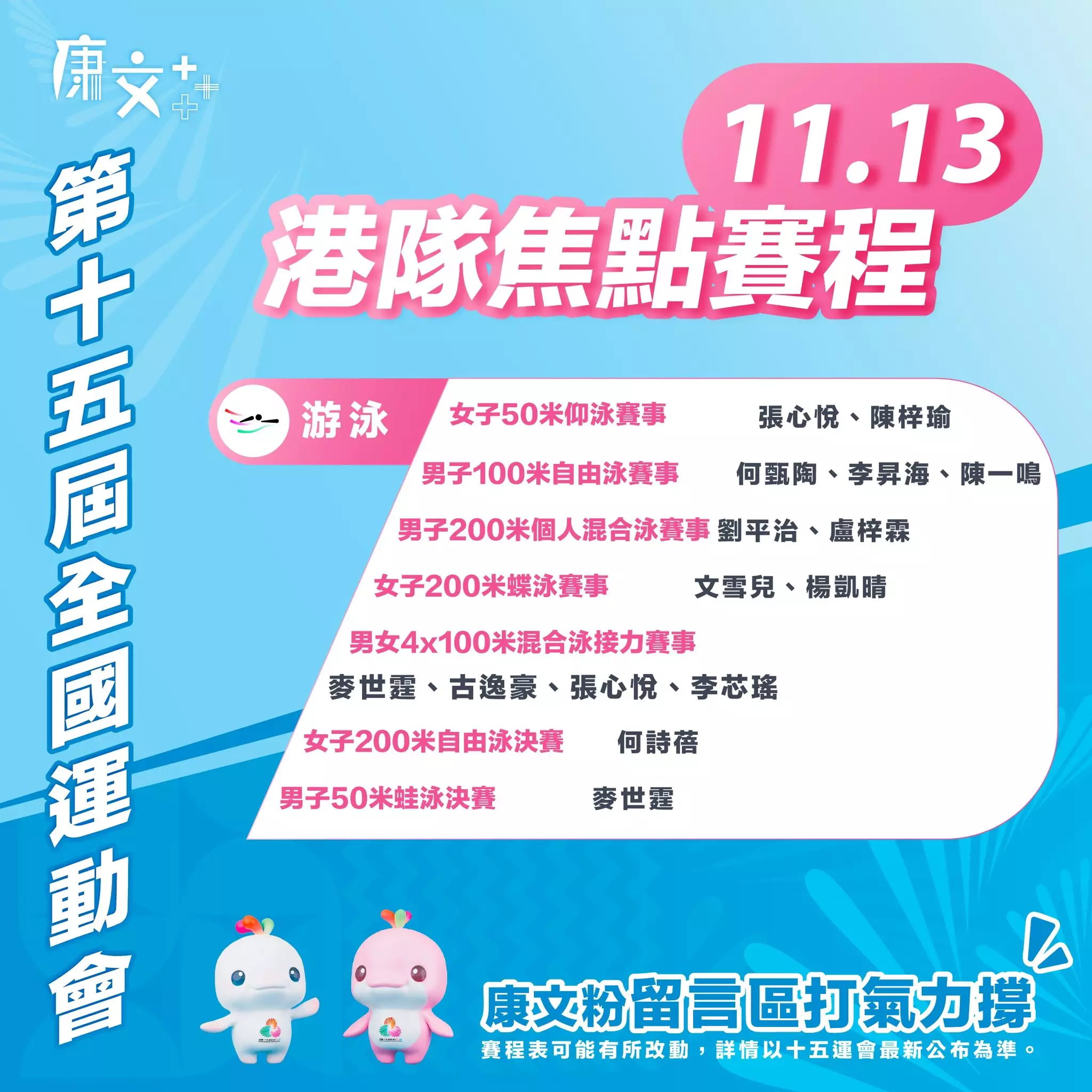 09:00 #張心悅 #陳梓瑜 出戰女子50米仰泳預賽,如順利晉級可出戰同日19:32嘅半決賽同埋14號19:52嘅決賽