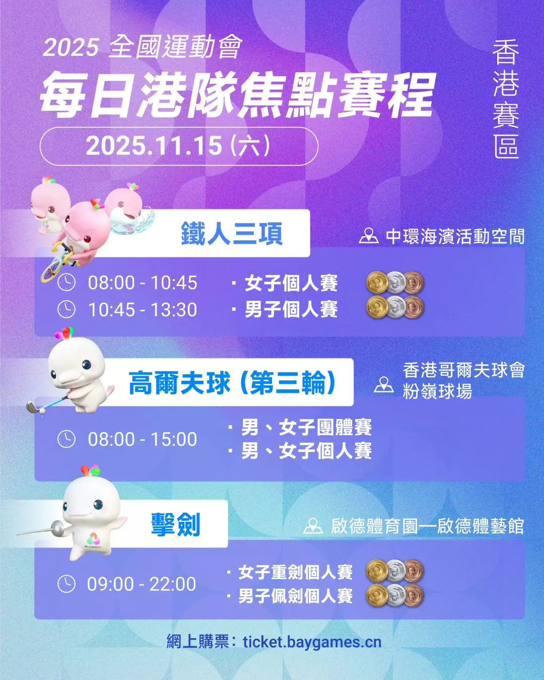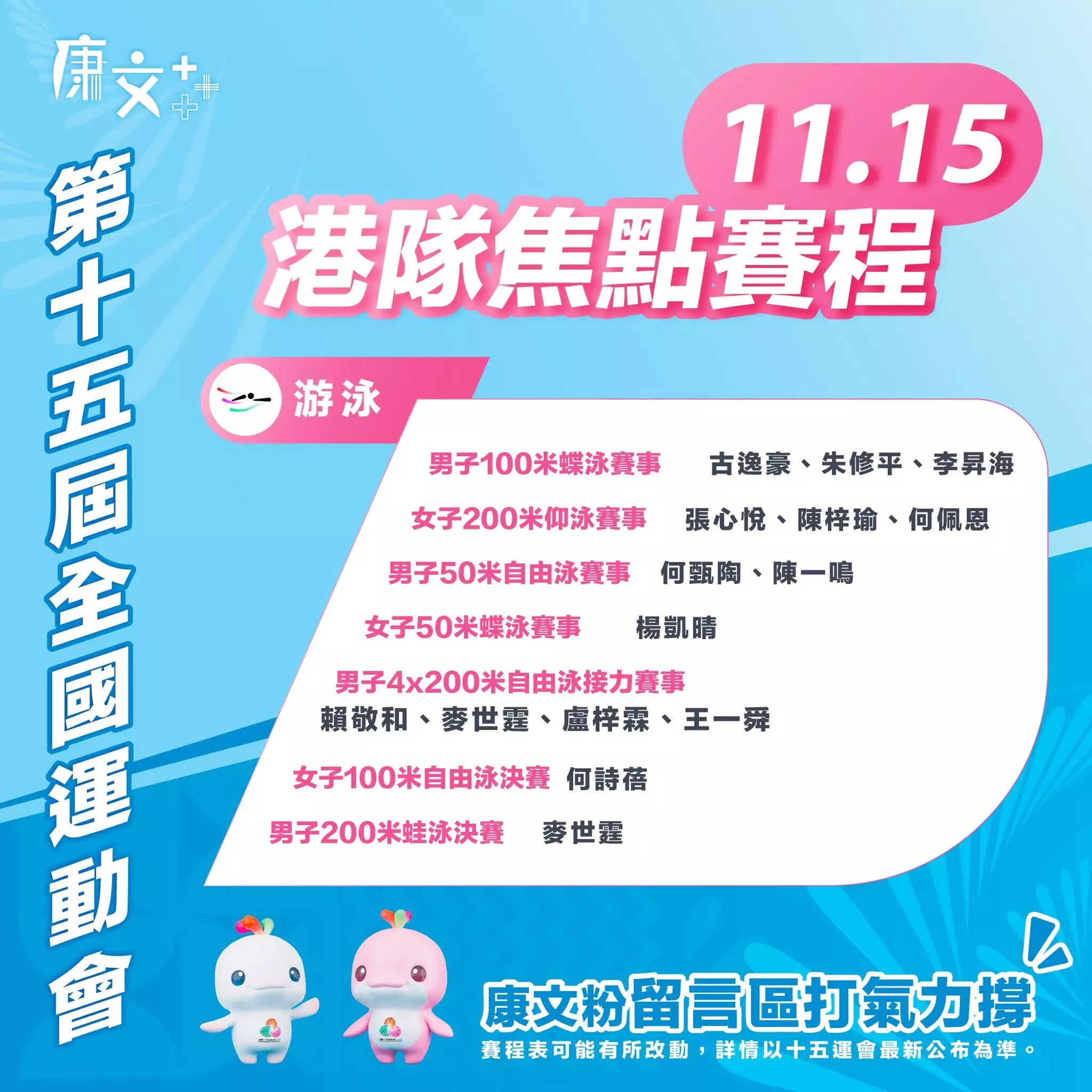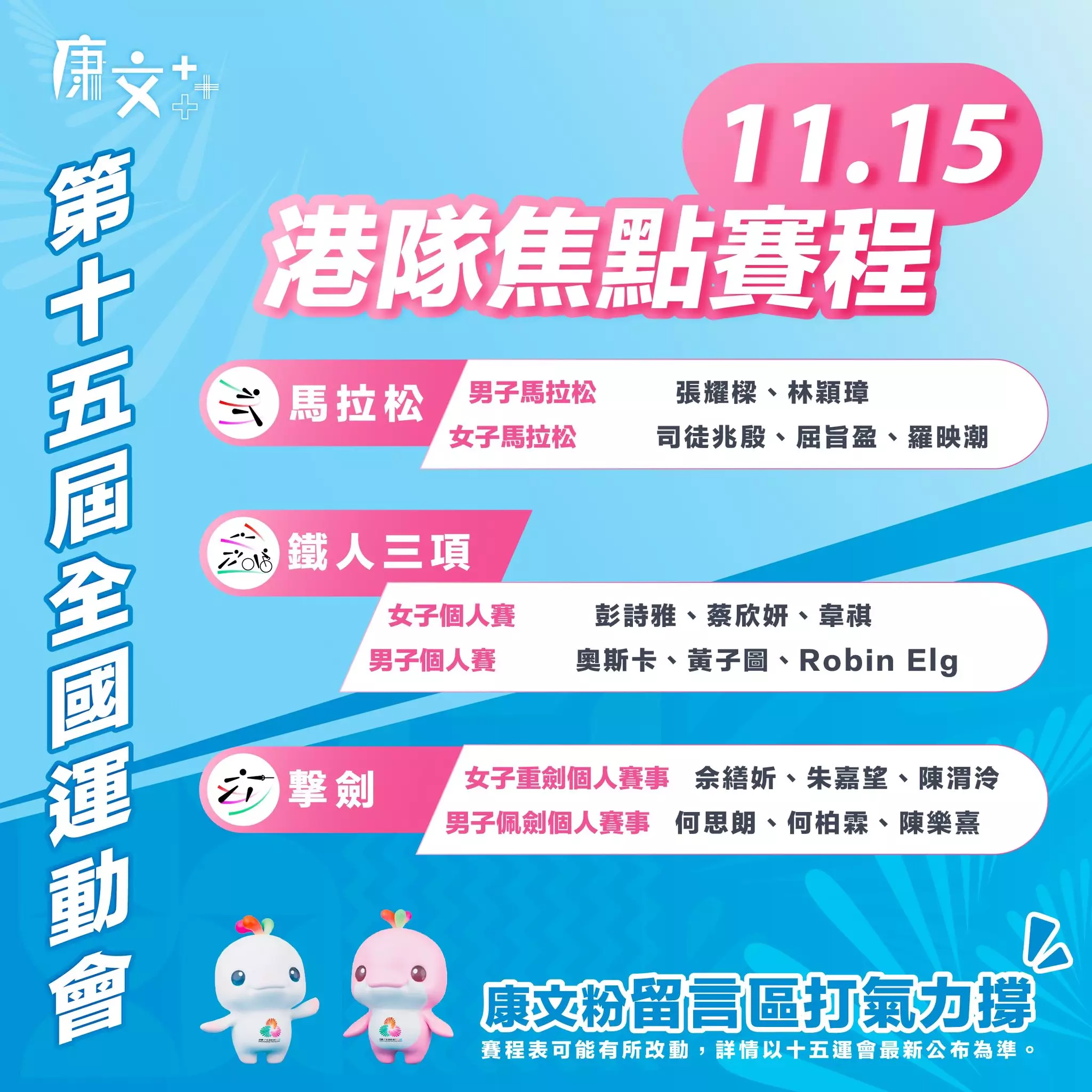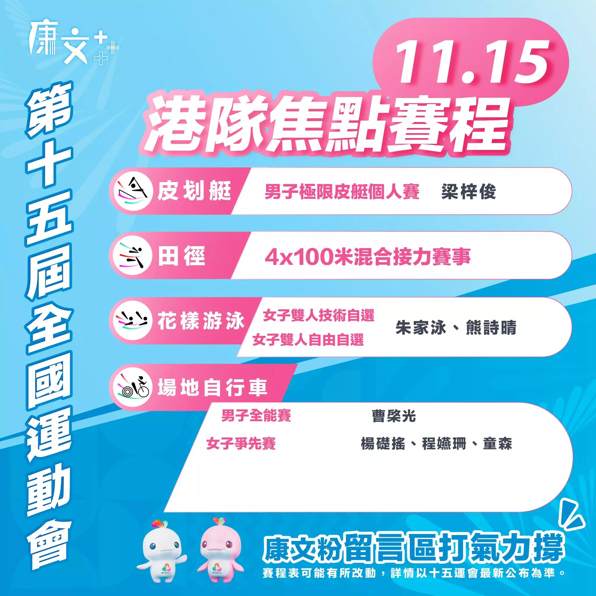 【#十五運會】全運會 11月15日港隊焦點賽程