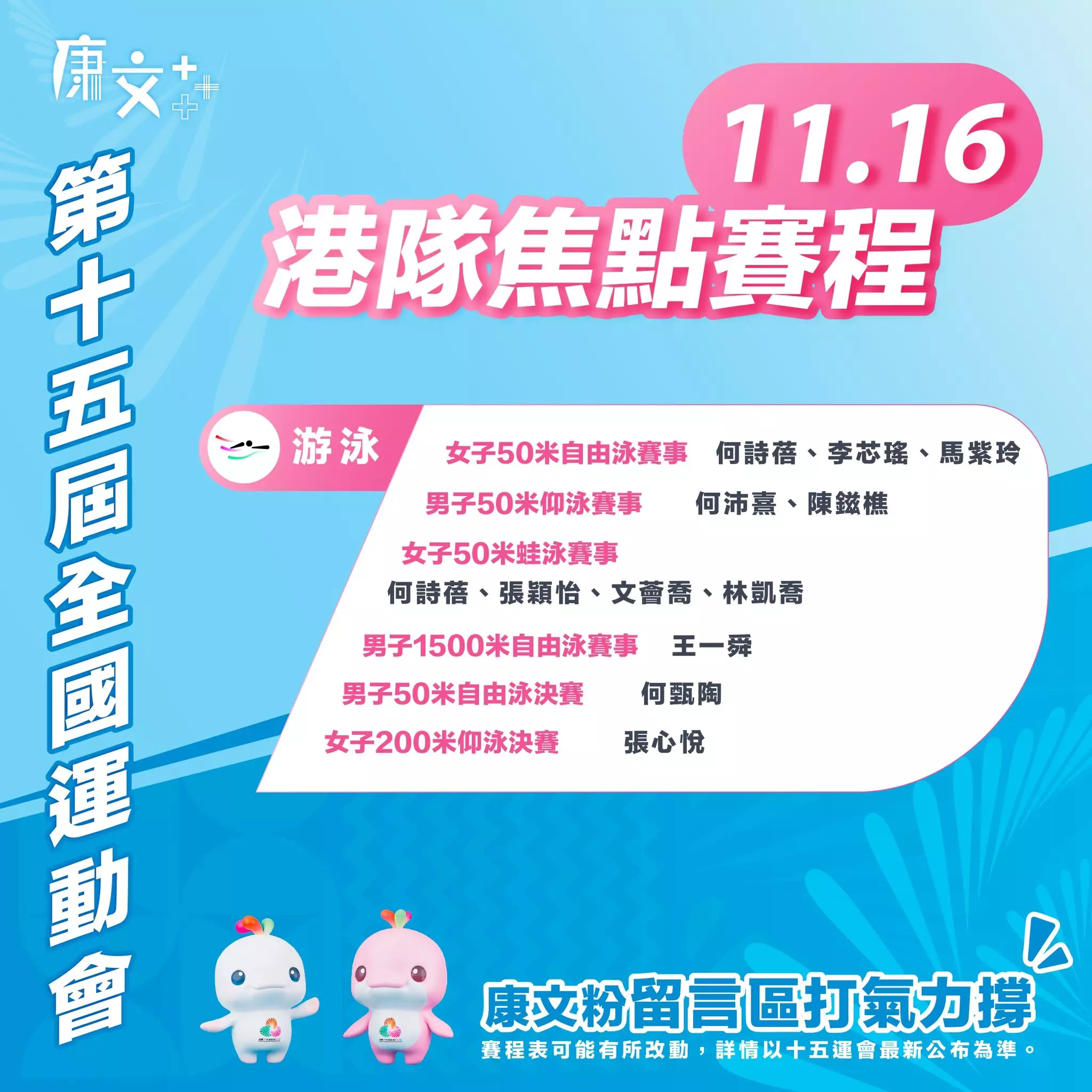 全運會香港隊代表聽日繼續出戰多項比賽,各位記低以下焦點賽程一齊為港隊加油打氣
