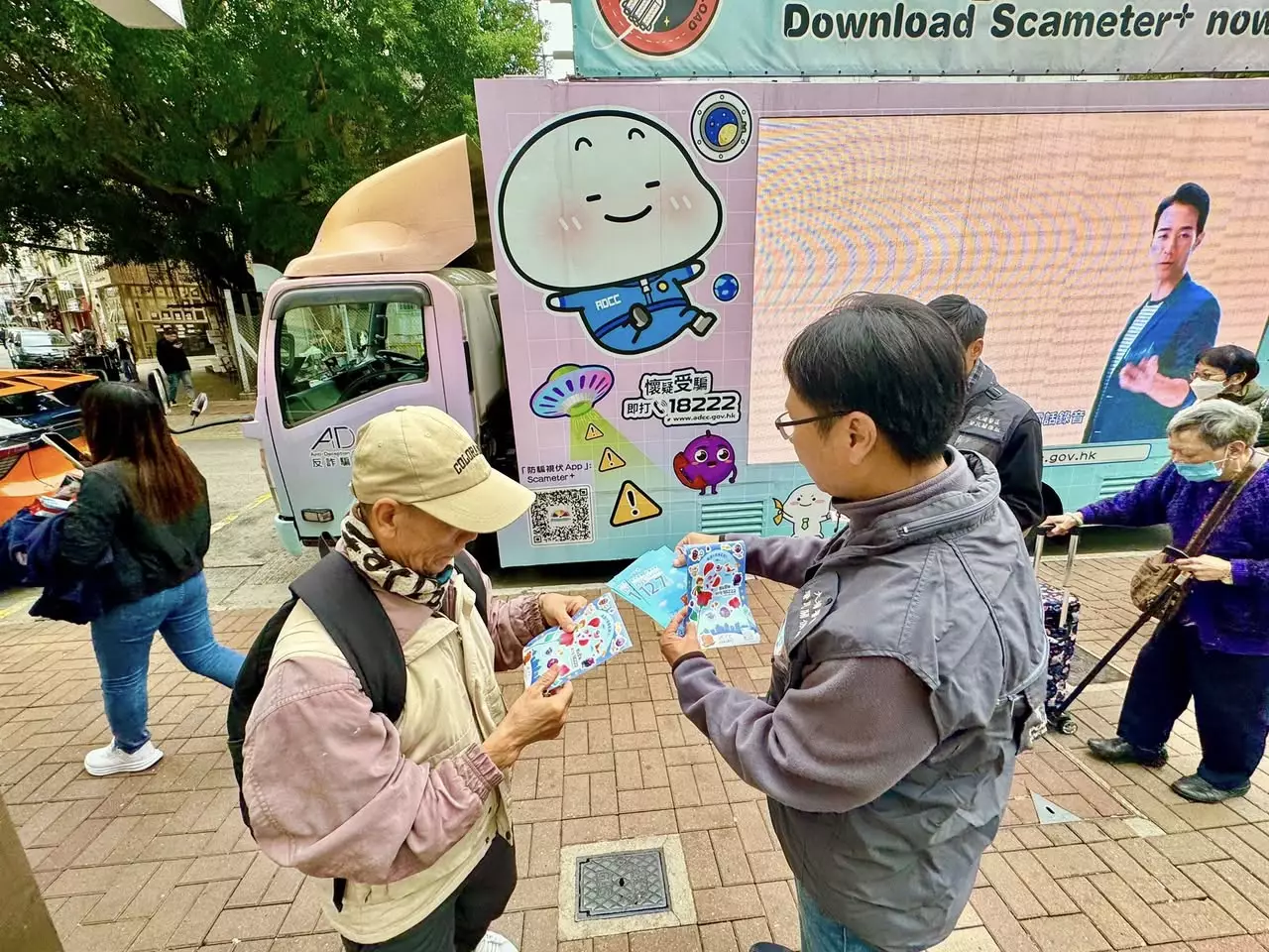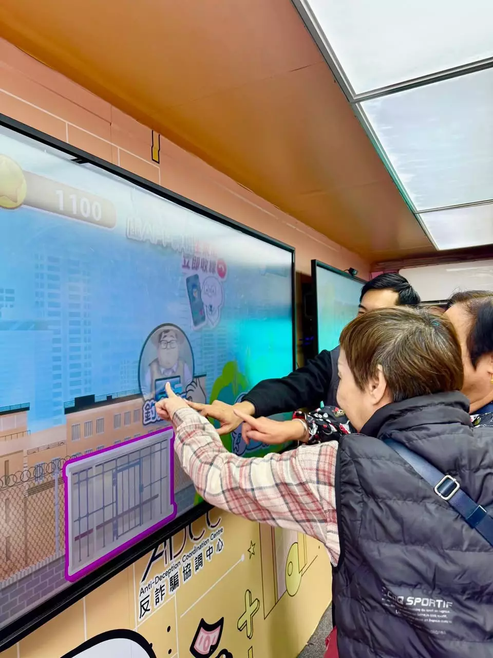 警民關係組人員現場指導市民操作「防騙視伏App」,並推廣「防騙三寶」:「收線、核實、搵求助」。宣傳車內設有多媒體互動設施,市民可透過情境模擬挑戰,深化對常見詐騙模式的認知,同時掌握實用防騙技巧。