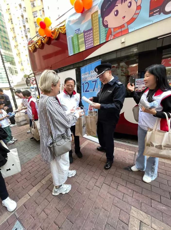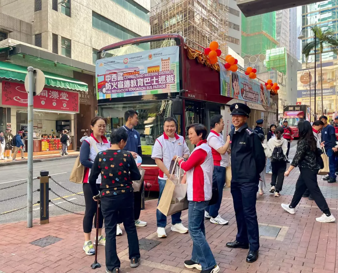 巡遊巴士沿途播放中英文雙語防火資訊,停靠上環街市、堅彌地城新海旁及中環5號渡輪碼頭等人流聚集點,由防火委員會委員親身派發防火宣傳品與紀念物,並講解火災預防措施。現場居民熱情參與,爭相與特色巴士合影,氣氛活躍。