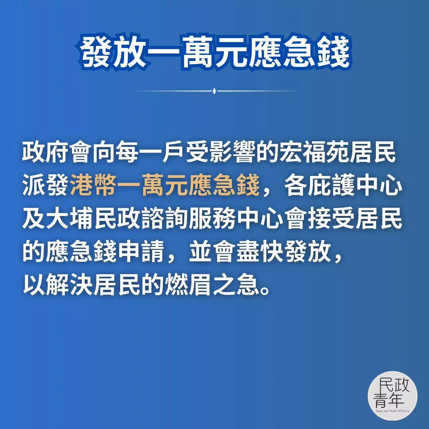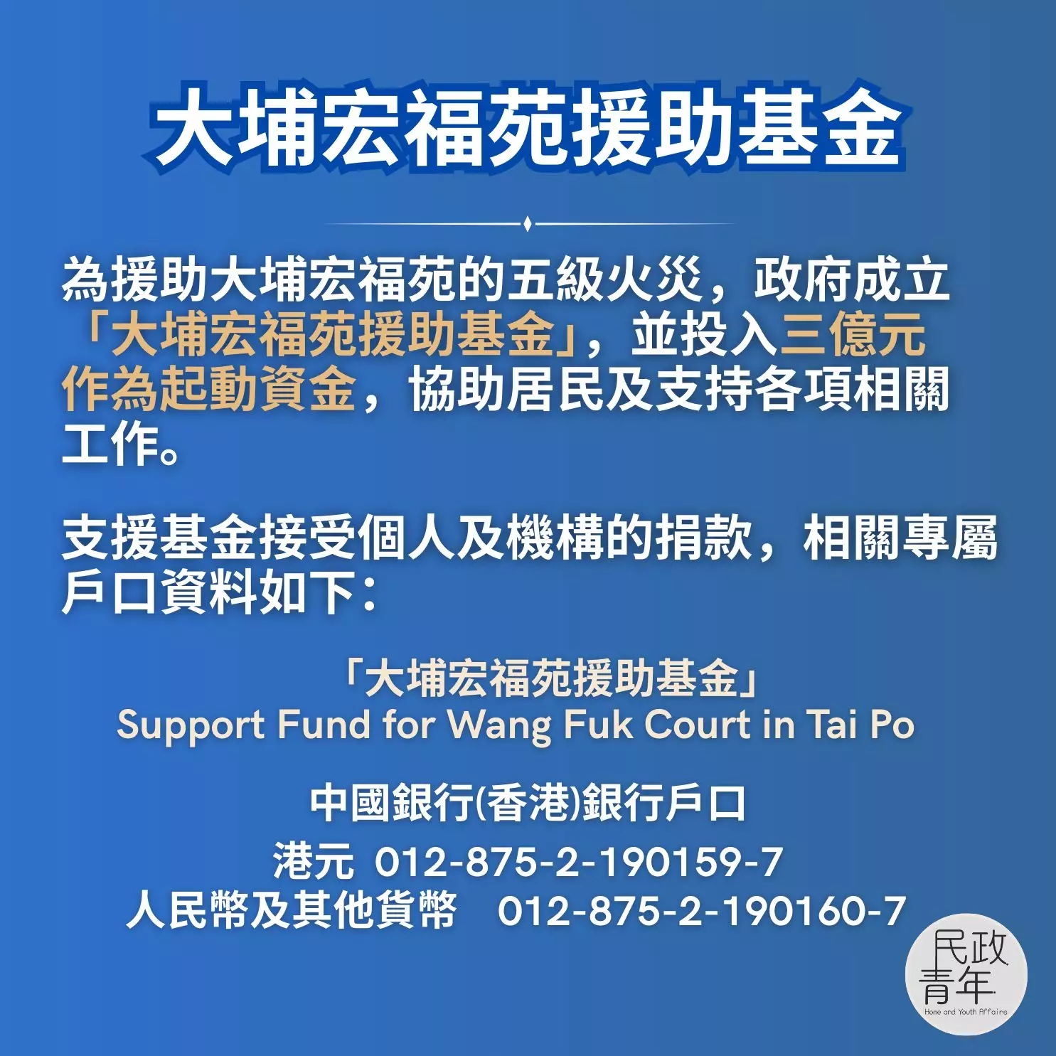 為應對大埔宏福苑的五級火災,政府成立「大埔宏福苑援助基金」接受捐款、發放每戶一萬元應急錢,以及提供住宿援助安排。民青局和民政署的團隊會謹守崗位,協助大埔宏福苑的居民渡過艱難時刻,希望所有市民能夠繼續支持和配合我們各方面的工作,亦感謝大家對受影響居民的關心和支持! 「大埔宏福苑援助基金 Support Fund for Wang Fuk Court in Tai Po」中國銀行(香港)銀行戶口 港元:012-875-2-190159-7 人民幣及其他貨幣:012-875-2-190160-7