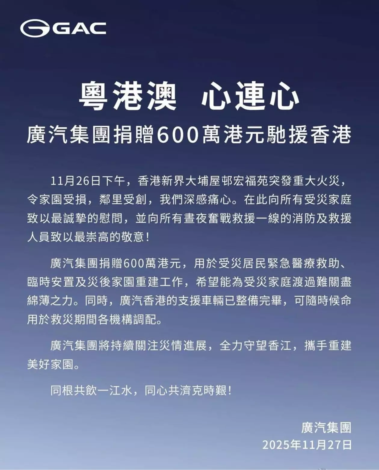 廣汽集團捐贈600萬港元,用於受災居民紧急醫療救助、臨時安置及災後家園重建工作,希望能為受災家庭渡過難關盡綿薄之力。同時,廣汽香港的支援車辆已整備完畢,可隨時候命用於救災期間各機構調配。