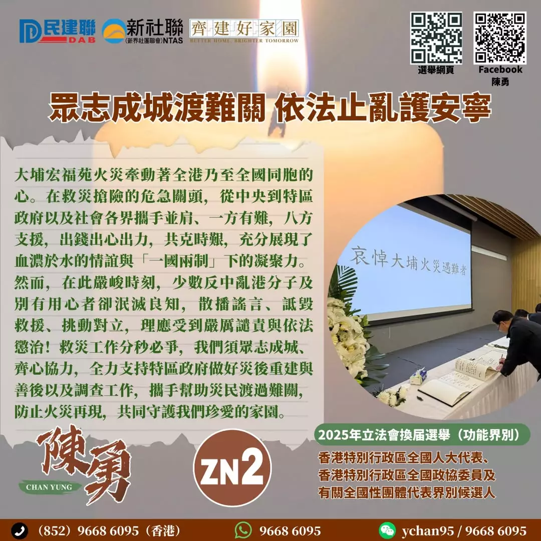 在這次沉痛的災難中,禍港分子依然如故,企圖將災難政治化,動搖香港來之不易的穩定局面,甚至妄圖讓香港重陷動盪與撕裂。這種將民眾苦難當作其政治籌碼的行為,不僅是對死難者與受災家庭的極大不敬,更是對整個香港社會與國家安全的嚴重挑戰。