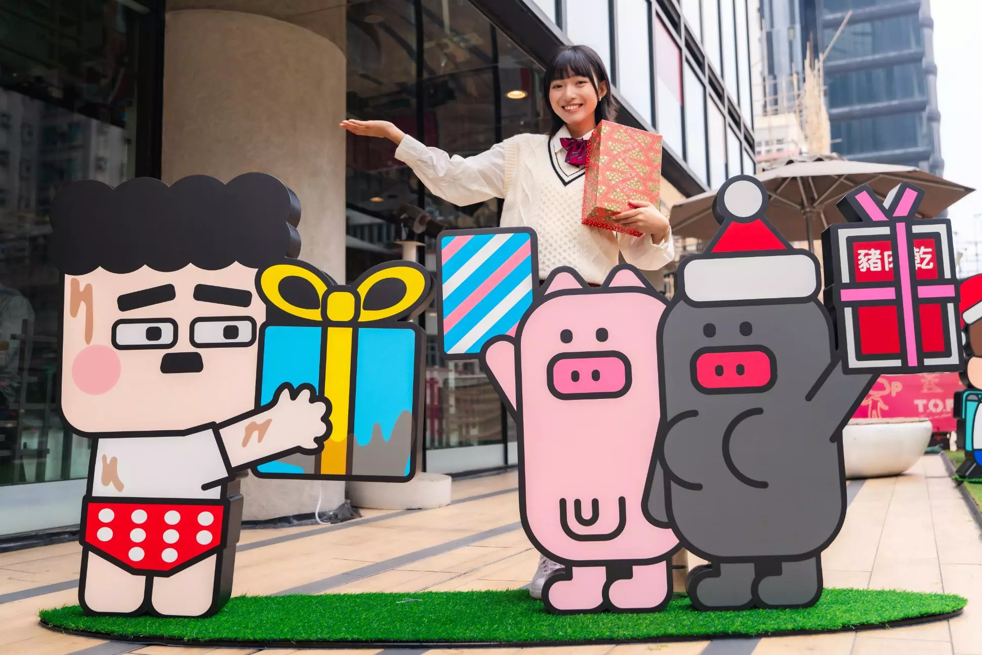 今年聖誕,T.O.P再度聯乘兩大鬼馬插畫家「東尼電機」及DDED,打造全港最長聖誕聯歡會。兩位創作人以幽默、創意及本土文化為核心,曾推出爆紅「懷孕動物」盲盒及「打工仔扮工牌」等原創玩具,深受年輕族群喜愛。