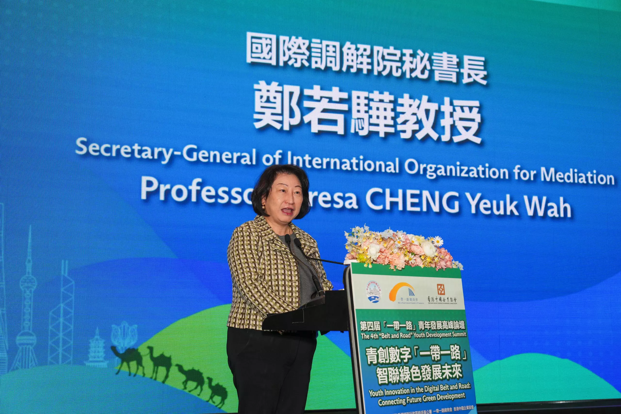 國際調解院秘書長鄭若驊教授隨後致辭,她表示,國際調解院是首個專門促進調解的政府間國際條約組織,目前有38個成員國,其中10個已批准公約,而38個成員國均為「一帶一路」合作夥伴。她指出,國際調解院總部設於香港,標誌著中國對香港的支持,以及各成員國對香港的信心。她強調「一帶一路」的三大原則,即共商共建共享,與調解精神相符。調解通過聯合或私下會議鼓勵對話,讓各方充分掌握過程和結果,並創造一個各方均可接受的共贏方案。她表示,調解最適合解決「一帶一路」爭端,因為它能促進合作和維持關係。