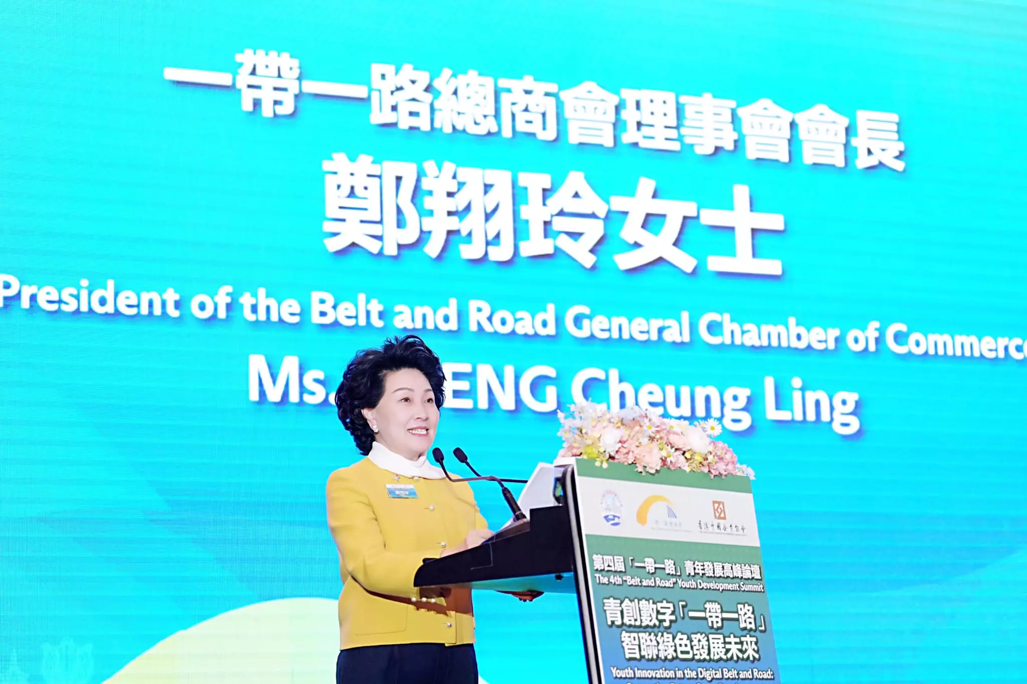 一帶一路總商會理事會會長鄭翔玲女士致歡迎辭。她說一帶一路總商會將通過國際青年僑商協作平台的擴容,聯動中東、中亞、東歐等新興市場,為青年創業項目對接資本、技術與市場,讓香港成為青年走向世界的「第一站」。她希望見到更多青年創業項目在一帶一路找到市場,呼籲在座的企業、投資機構與政府代表,積極為青年提供資源支持,做到開放平台、賦能生態、深化融合。